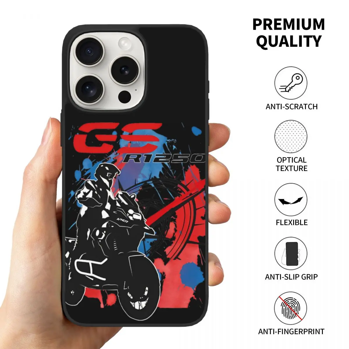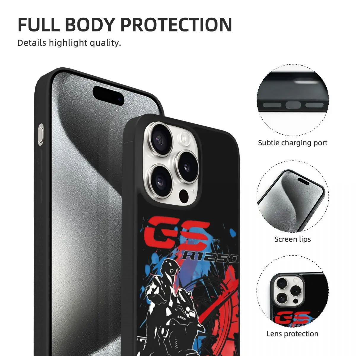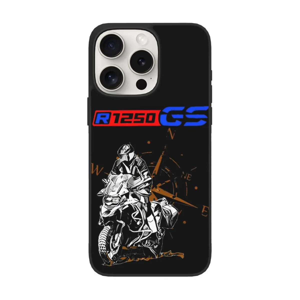 This Fashion TPU Case is expertly crafted for the iPhone 15 Pro and iPhone 15 Pro Max, ensuring a perfect fit for your device. The case features a sleek black background, contrasted by a striking white and gray silhouette of a motorcyclist, capturing the spirit of adventure and motorcycle culture. With bold red “GS R1250” lettering, the design stands out and adds a lively pop. Designed for practicality, it boasts anti-fingerprint, anti-scratch, and dustproof properties, ensuring that your case retains its fresh look. Experience robust protection wrapped in a trendy aesthetic, making it an ideal accessory for any motorcycle enthusiast.