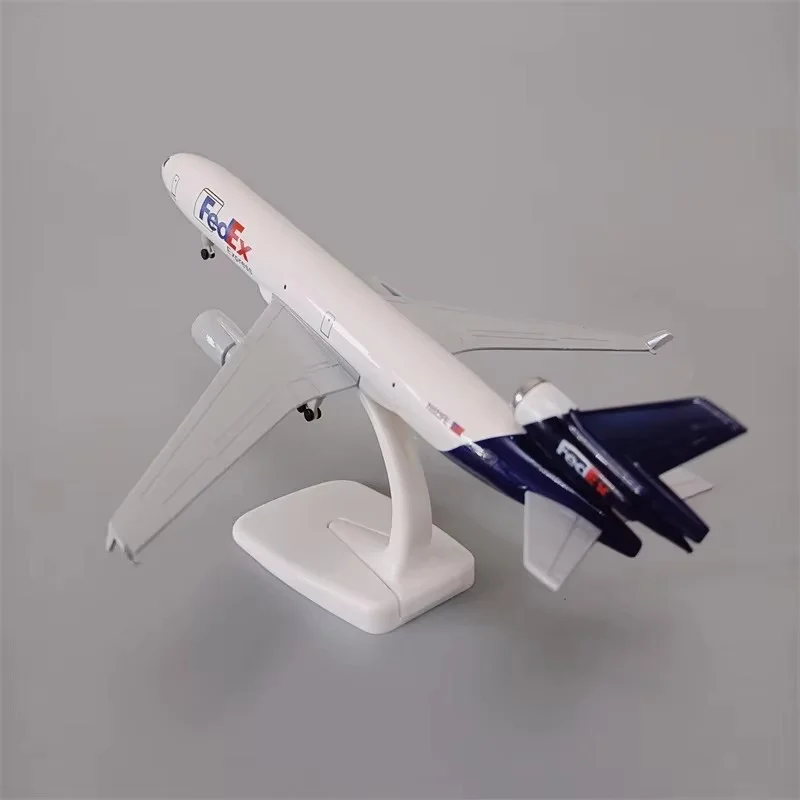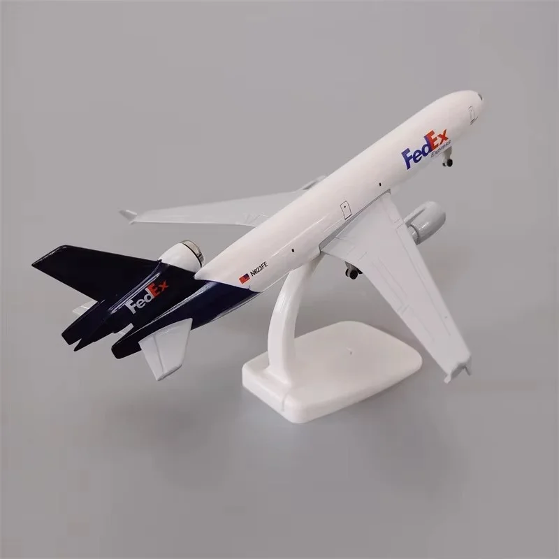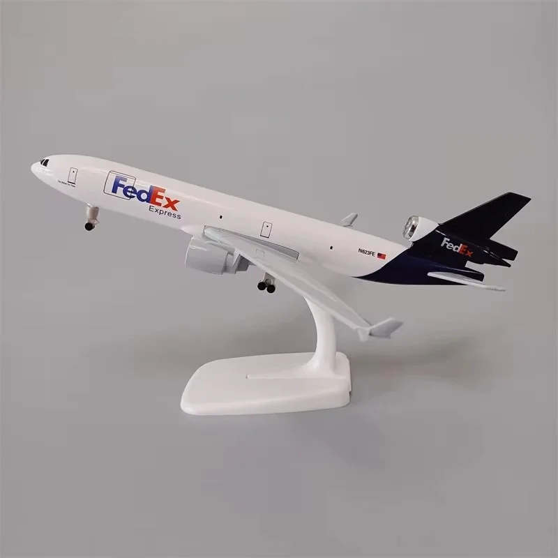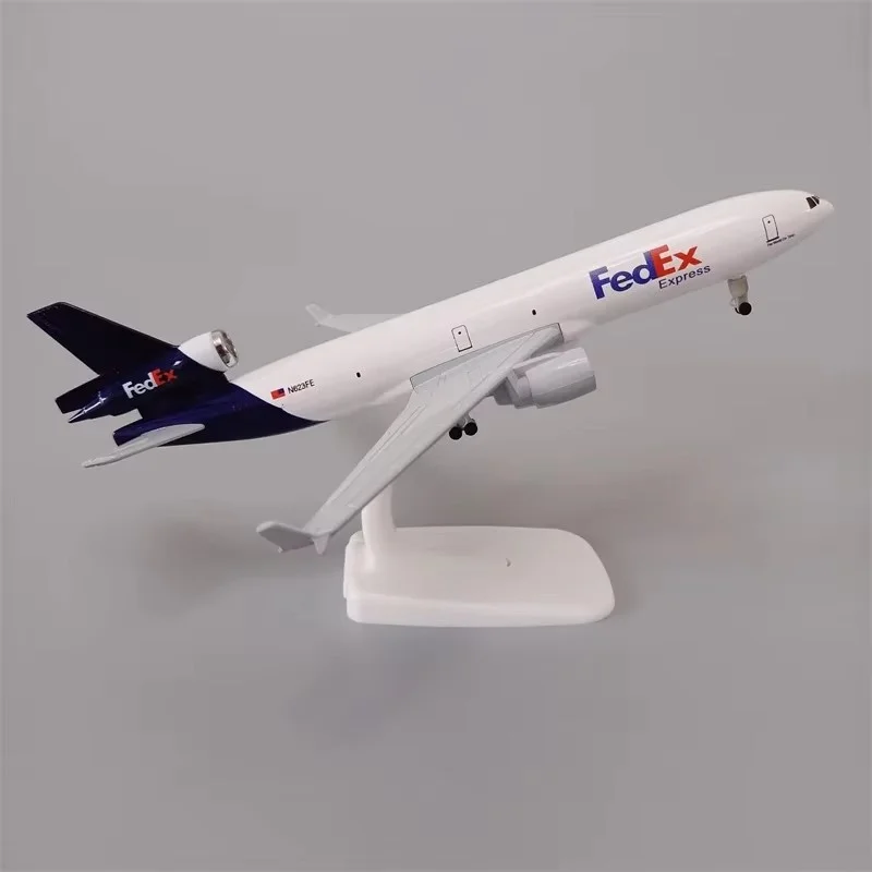 This 20cm diecast alloy model airplane represents the FedEx Express MD-11, showcasing a striking white and dark blue color scheme synonymous with FedEx branding. Crafted with a sturdy metal body complemented by plastic supports, this model features realistic miniaturized landing gears and wheels for an authentic look. The prominent FedEx logo in blue and orange adorns the fuselage, enhancing its visual appeal. The elegant diorama-style white support base allows for display at an angle, evoking a sense of flight. Perfect for home decor or as a gift, this model is designed for aviation enthusiasts and collectors, ensuring a high-quality presentation.