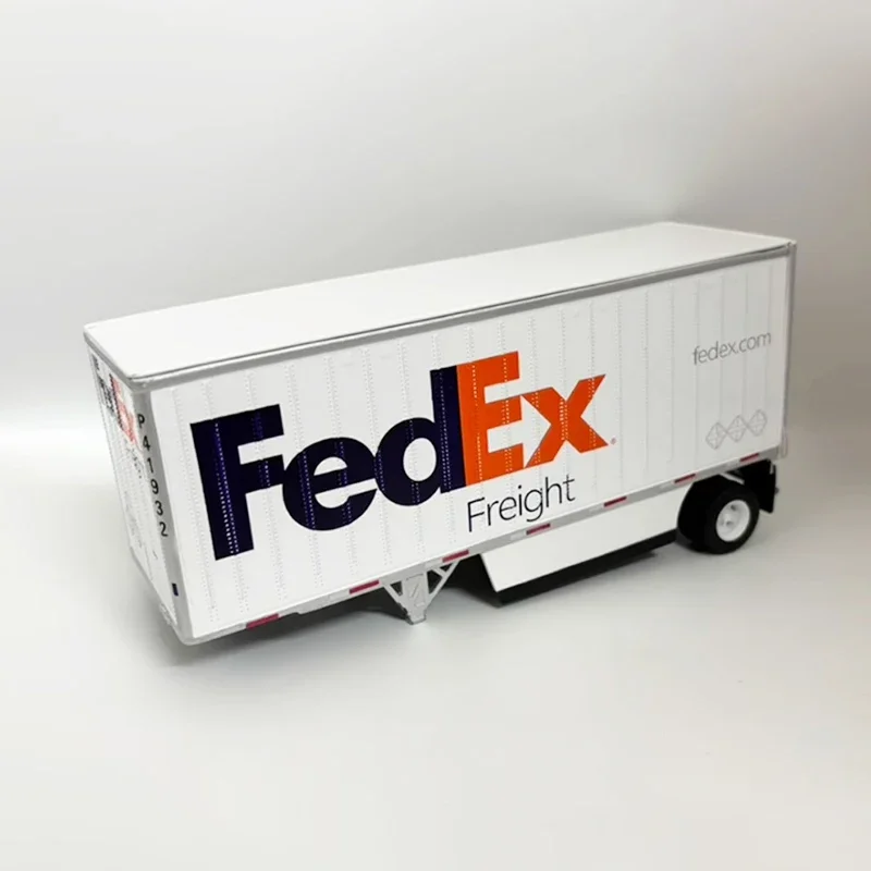 This highly detailed diecast 1:50 scale model of a FedEx container freight truck measures 17 cm in length, 5.5 cm in width, and 8.5 cm in height, crafted from alloy and plastic for a realistic appearance. The sleek white truck features the iconic FedEx logo in dark blue and bright orange on the container, which has a smooth rectangular shape with subtle texturing to mimic corrugated steel. Small black wheels with white centers and gray support structures add authenticity and stability, making it an excellent collectible for display or gifting enthusiasts. This non-electric model is perfect for those who appreciate precision and industrial style in their collection.