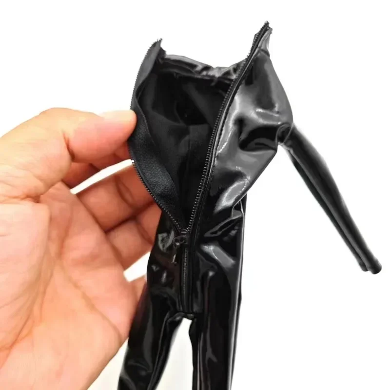 - Includes a shiny black PU leather bodysuit, which is form-fitting, durable, and visually striking, with a partially unzipped front for a modern, edgy look.