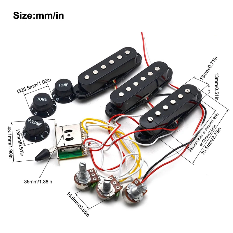 Imagine the perfect sound for your Fender Strat-style guitar — smooth, responsive, and reliable. This prewired wiring harness makes that a reality, offering a straightforward upgrade that enhances your guitar’s performance and tone control. Crafted with precision from durable metal and plastic components, it features a sleek black or white finish to match your style. The harness includes a 5-way switch, three 250K full-sized potentiometers (two tone and one volume), and a clean, organized wiring layout, ensuring easy installation. Whether you're replacing an old harness or building a custom instrument, this component promises durability, excellent sound quality, and a refined look. Elevate your guitar experience today with this premium upgrade.