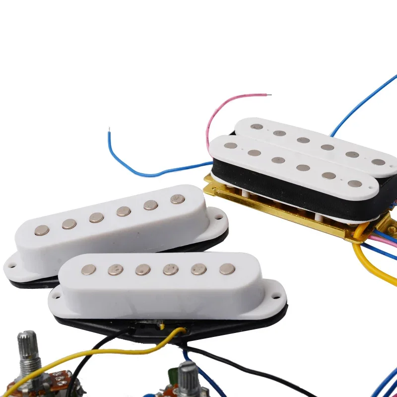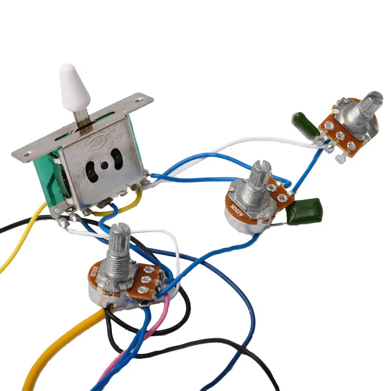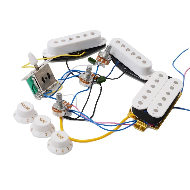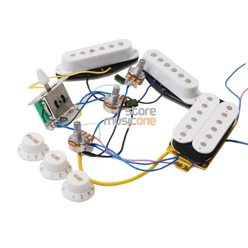 Enhance your Fender Stratocaster with this prewired wiring harness featuring a sleek black or white SSH pickup system, a 5-way switch, and three full-size 250K potentiometers in a 2T1V configuration. The assembly includes black knob caps, a combination of durable metal and plastic parts, and is designed for easy installation. This high-quality harness allows for versatile pickup selection and precise tone control, offering a streamlined upgrade for your electric guitar. Compatible with various Stratocaster models, it delivers reliable performance and a clean, modern aesthetic. Perfect for customizing your guitar’s sound while maintaining a professional, polished look.