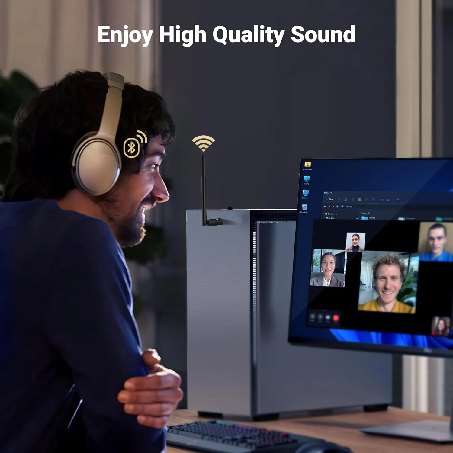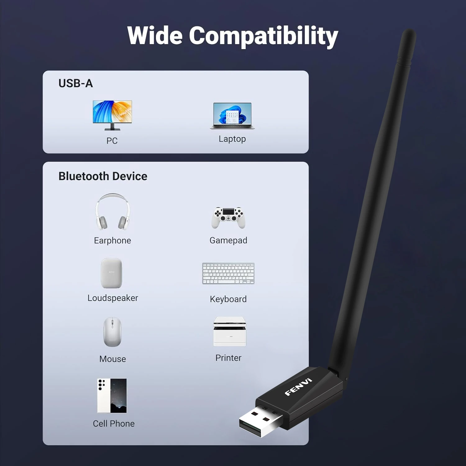 Experience seamless connectivity with the fenvi Bluetooth 5.4 USB dongle, a modern accessory designed to elevate your wireless experience. Its sleek, glossy black finish and compact structure combine with a polished USB connector to create an aesthetically pleasing addition to your tech setup. The thoughtfully integrated matte black external antenna ensures optimal signal strength and flexibility, allowing you to enjoy an impressive transmission distance of up to 20 meters. With plug-and-play functionality, this dongle connects effortlessly to your devices running Windows 10 and 11, enhancing your multimedia activities without needing extra drivers. Visualize connecting effortlessly to speakers, headphones, gaming controllers, and more—all thanks to this intelligent device.
