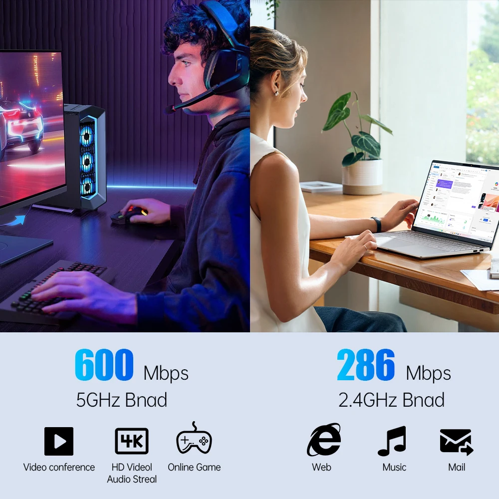 - Offers dual-band communication on 2.4GHz (286Mbps) and 5GHz (600Mbps) for optimal performance in various settings.