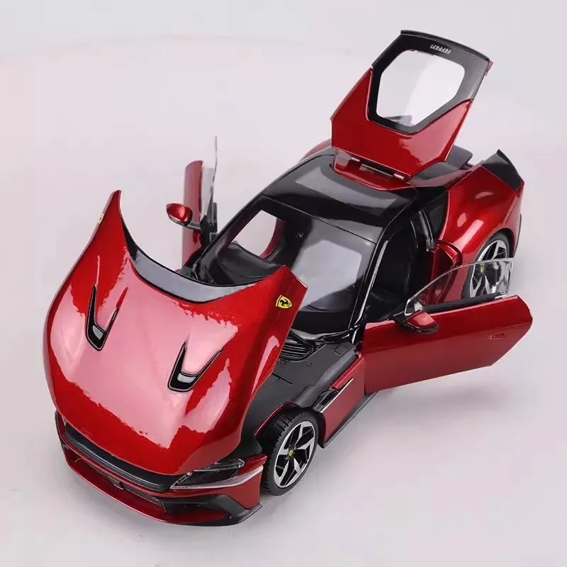Discover the striking aesthetics of this detailed miniature model of a Ferrari 12-cylinder sports car by Bburago. Crafted with high-quality die-cast alloy, this 1:24 scale replica vividly captures the car’s sleek, aerodynamic design, emphasizing smooth curves and sharp lines. The vibrant red finish makes it a standout piece, with black-tinted windows and streamlined supports for the side mirrors that enhance its aggressive appearance. The model features meticulously styled black alloy wheels with silver accents and central yellow Ferrari emblems, paired with flared wheel arches that underline its sporty character. Subtle hood detailing and rear textured elements, possibly representing exhaust vents or diffusers, add realism. Its overall craftsmanship makes it an ideal collectible, gift, or display ornament for automotive enthusiasts and collectors alike.