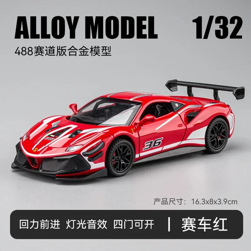 The 1:32 scale diecast model of the Ferrari 488 supercar is crafted from high-quality alloy material and features impressive sound and light functions. Finished in a striking red color with white and black accents, it boasts a sleek aerodynamic body with aggressive lines, a low pointed nose, and detailed headlights and air vents. The model operates via a pull-back mechanism, requiring no batteries. It includes a prominent rear wing, textured black tires mounted on slim black wheels, and a large number “36” on the sides, highlighting its racing aesthetic. Available in red, green, yellow, and blue colors, it’s ideal for collectors and enthusiasts.