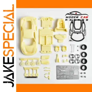 - Components include a detailed body shell, matching interior parts, black plastic window frames, four silver wheels, and decorative decals for realism.