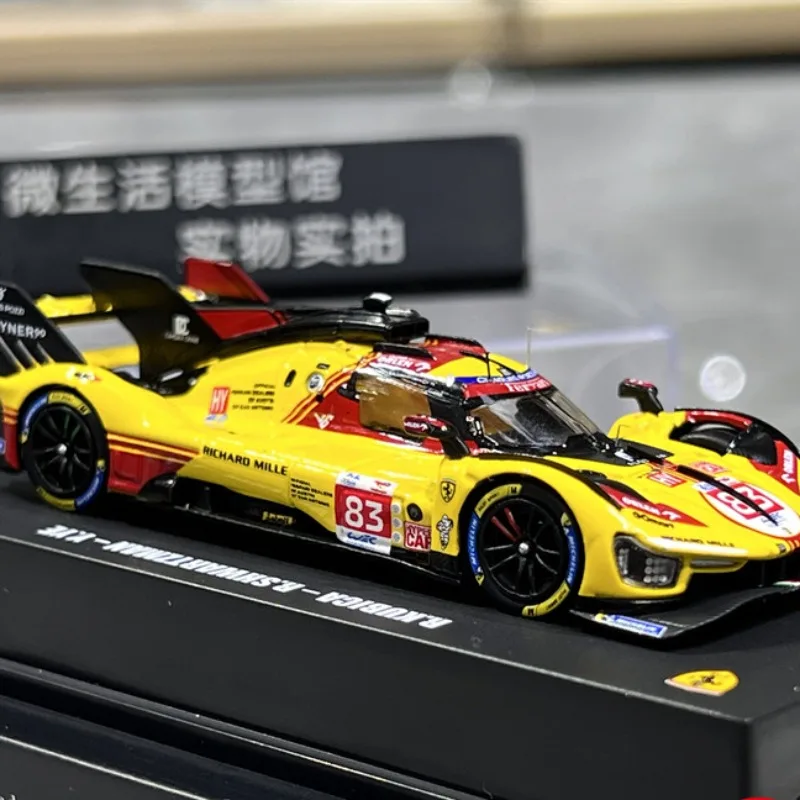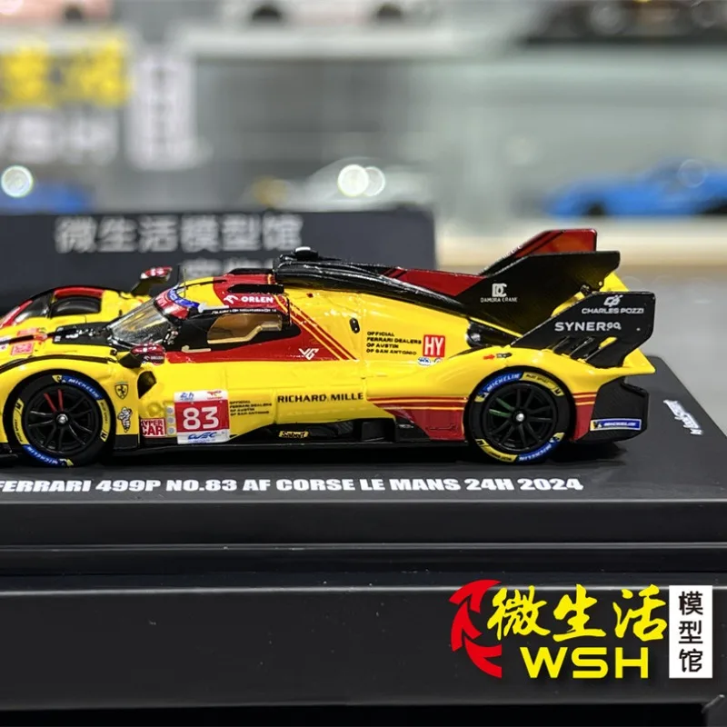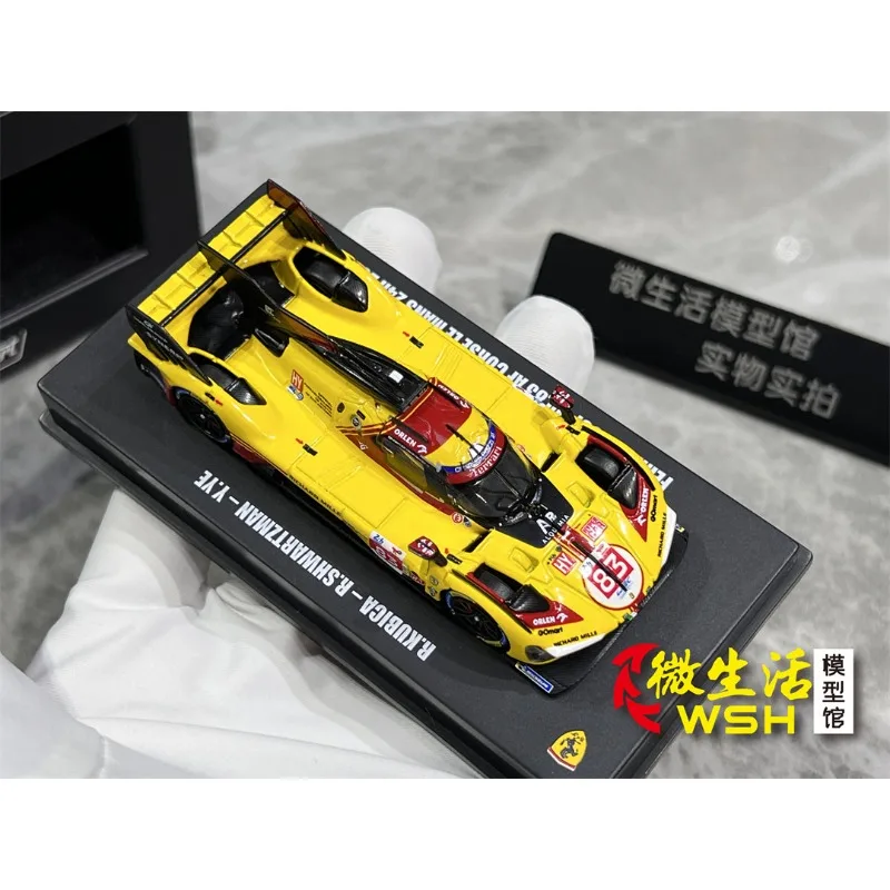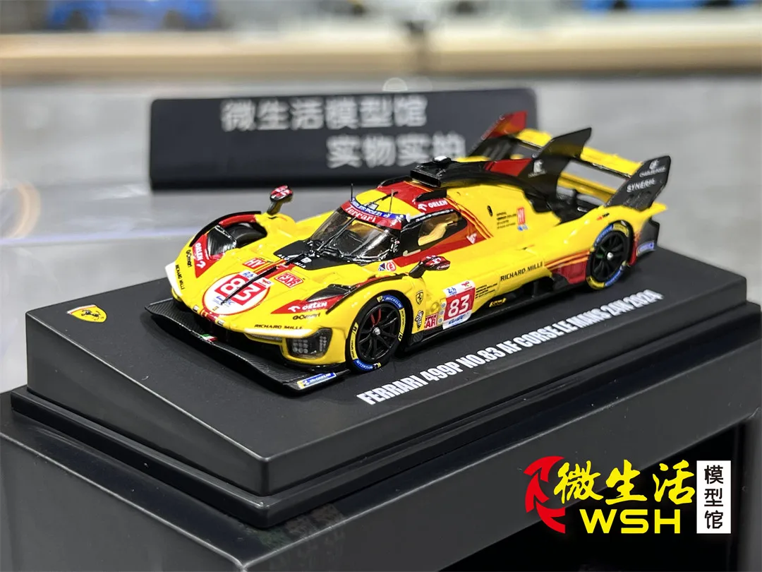 This 1:64 scale diecast alloy model captures the sleek design of the Ferrari 499P AF Corse Le Mans race car, measuring approximately 7 cm in length. Crafted with an alloy body, plastic chassis, soft rubber tires, and ABS plastic interior, it offers realistic detailing and a vibrant visual appeal. The model features a glossy yellow finish with striking red accents around the windshield, roof, and side panels, complemented by black aerodynamic details on the rear wing, front splitter, and side mirrors. Its black rims with blue accents and soft rubber tires complete the authentic racing look, making it a perfect collectible for display.