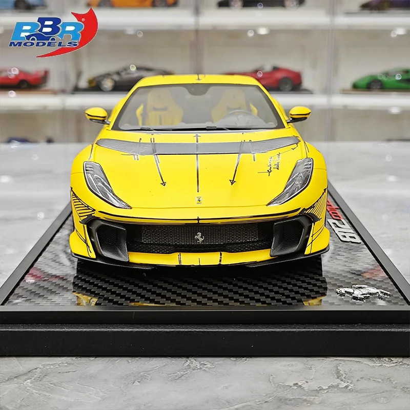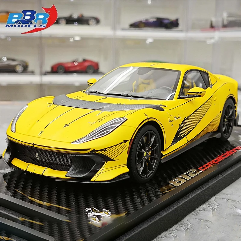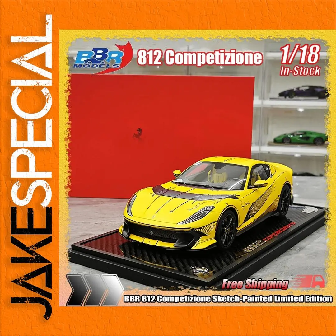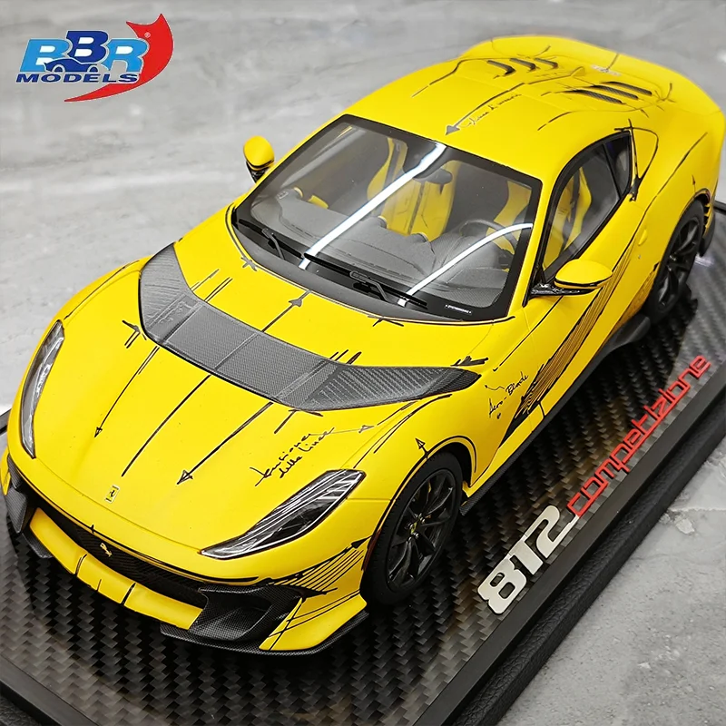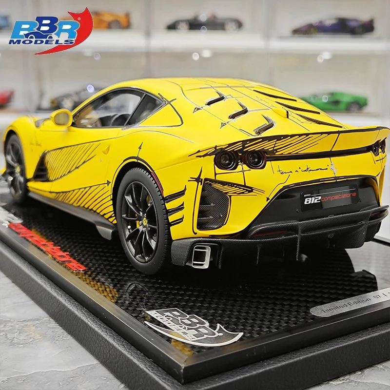 This highly detailed diecast miniature captures the essence of the Ferrari 812 Competizione with a vivid yellow exterior accented by bold black graphic striping along the sides, creating an aggressive yet elegant look. The sleek, aerodynamic silhouette highlights sculpted lines and curves that emphasize the sports car's dynamic design. Incorporating transparent windows, the model reveals an intricately detailed interior, including seats, steering wheel, and dashboard features. The realistic black rims and textured rubber tires enhance the authenticity. Mounted on a textured black display base with a carbon fiber pattern, it showcases the high-end craftsmanship and collectible exclusivity of this limited edition piece. The Signature markings and sketch-painted finish add further distinction, making this an ideal display item for enthusiasts and collectors.