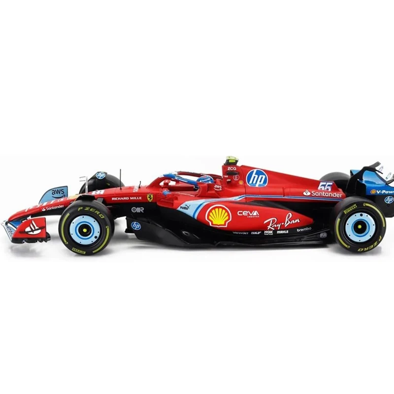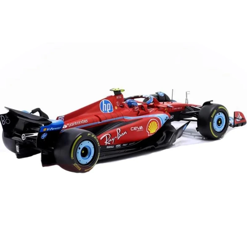 Imagine owning a meticulously crafted replica of the real Ferrari F1 SF24 driven by Sainz at the Miami GP. The vibrant red exterior catches the eye, reflecting the sleek, high-performance design of the actual race car. Every detail, from the aerodynamic front and rear wings with winglets to the streamlined chassis and detailed side mirrors, exudes precision craftsmanship. The black rubber tires feature a distinctive yellow stripe along the sidewalls, paired with glossy blue rims, creating a striking contrast. Made of alloy, environmentally friendly ABS plastic, and durable die-cast parts, this model offers a realistic and sturdy feel. It’s a perfect collector’s item, capturing the spirit of Formula 1 racing with authenticity.
