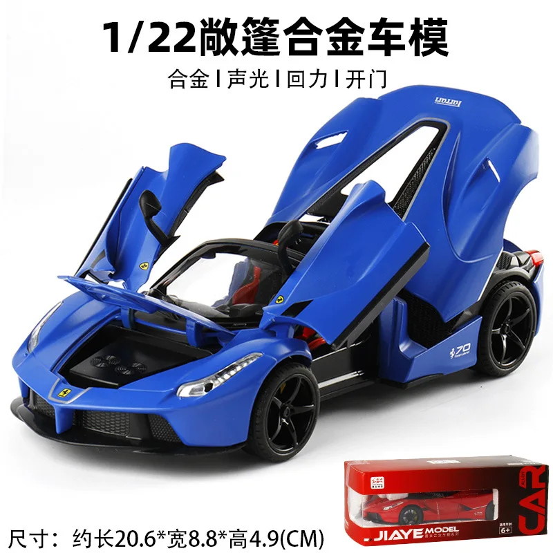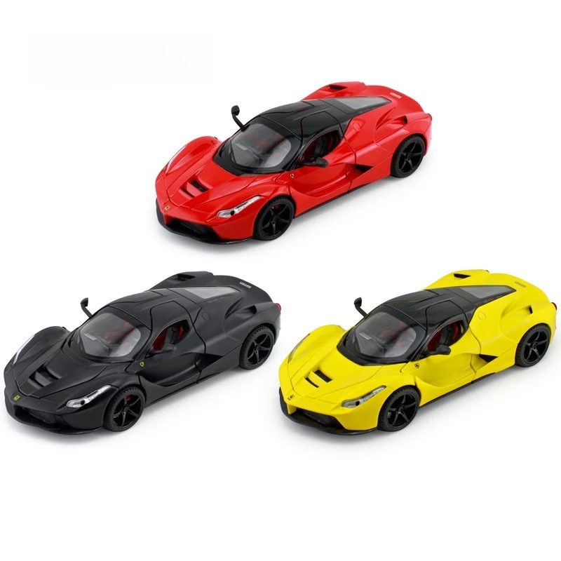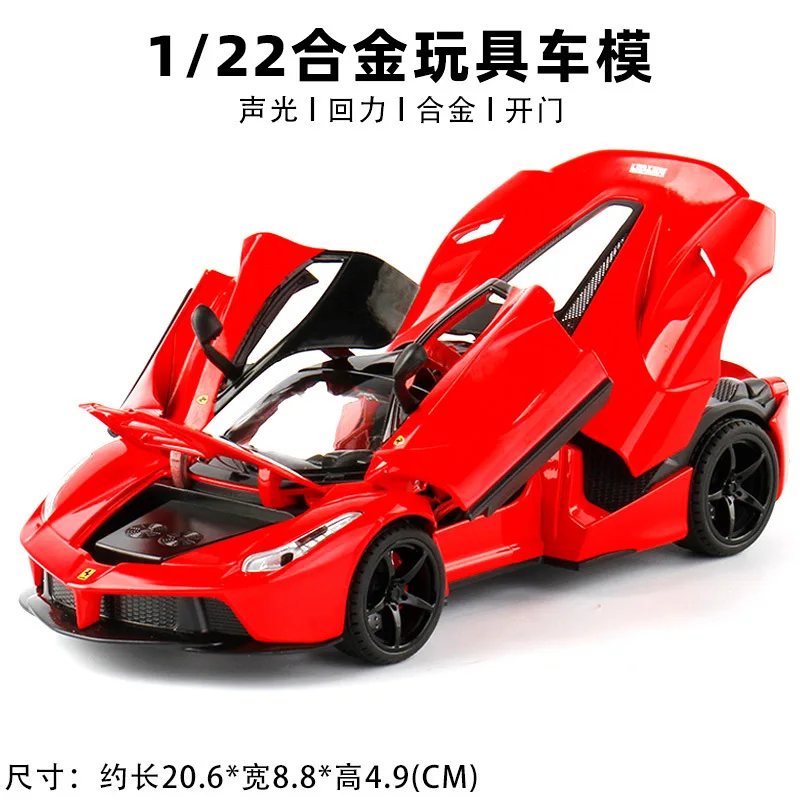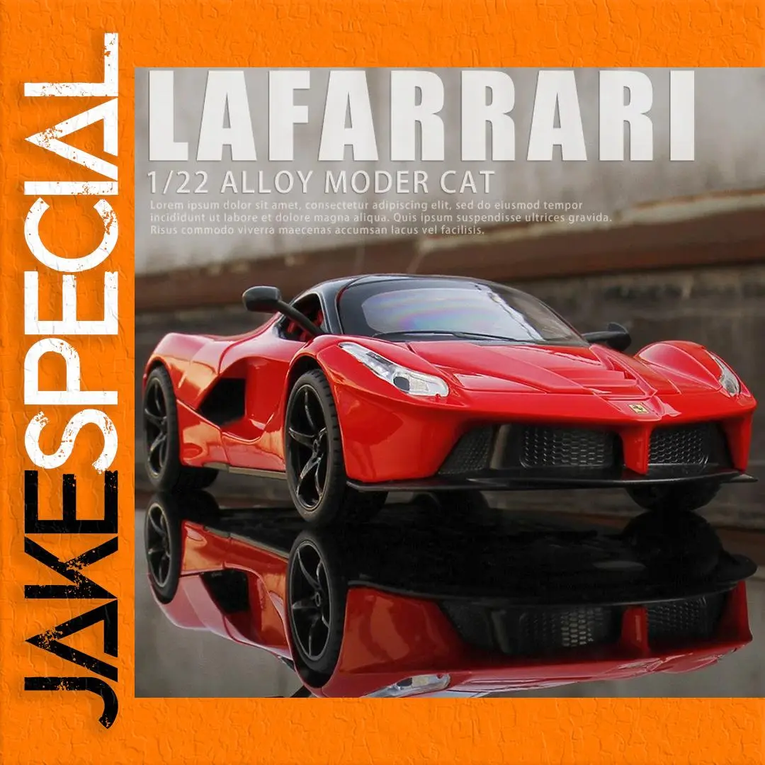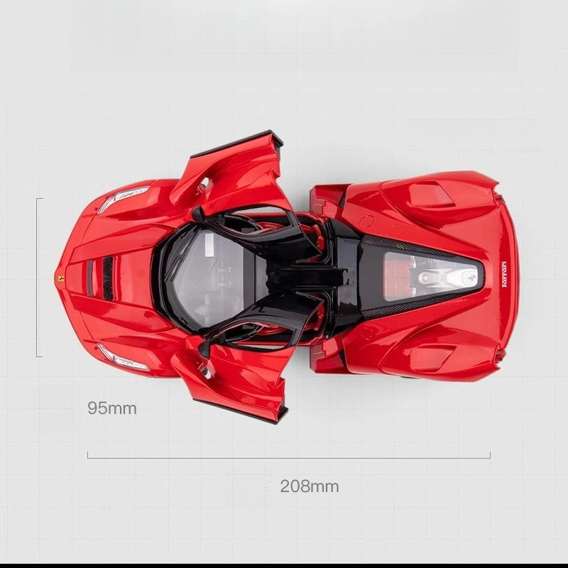Experience the thrill of owning this remarkable 1:22 scale Ferrari LaFerrari FXX K diecast model, meticulously crafted from durable metal alloy to ensure lasting quality and stability. Its vibrant, glossy red finish captures the supercar’s high-performance essence, reflecting light beautifully to emphasize aerodynamic contours, textured vents, and sharply molded features. The meticulously detailed exterior showcases a wide grille with fine mesh detailing, sharply sculpted headlights, and contrasting black accents on side mirrors and wheel arches. The multi-spoke black wheels with silver rims add an authentic touch. Inside, clear plastic windows reveal an intricately detailed interior, including visible seats and dashboard. Powered by batteries, it features realistic lighting and sound effects, offering an engaging display piece for enthusiasts and collectors alike.