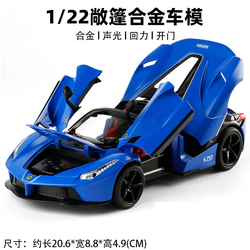 The 1:22 scale diecast model of the Ferrari Laferrari FXX K is crafted from a durable metal alloy and presented in a striking bright red color. This meticulously detailed model showcases the car’s aerodynamic design, featuring sleek headlights, a prominent mesh-patterned grille, and a smooth hood with a distinct Ferrari emblem. Its dynamic profile boasts well-defined curves, complemented by black multi-spoke wheels with rubber-like tires, adding realism. Equipped with sound and light functions powered by a button battery, this model captures the essence of high-performance luxury. Available in various colors, including hardtop black and convertible blue, it’s a definite must-have for collectors.