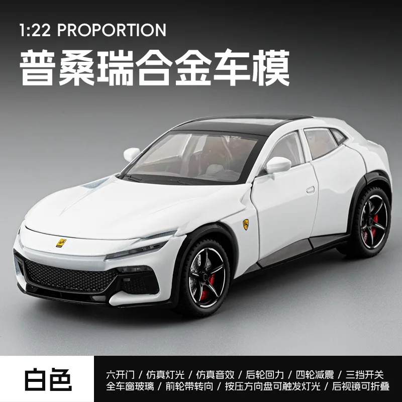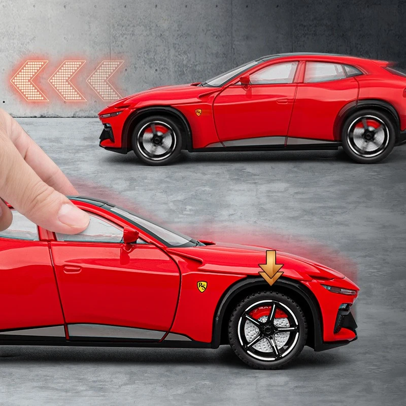 Immerse yourself in the world of luxury and automotive excellence with this high simulation alloy model of the Ferrari Purosangue FUV, designed at a captivating 1:22 scale. Crafted from high-quality diecast metal, this stunning model showcases a vibrant red color with a glossy finish, making it an eye-catching piece for any collection. Its meticulous design highlights sleek lines, aggressive styling, and intricate detailing, from the prominent grille to the sleek taillights. Experience the thrill of sound and light effects powered by a button battery, bringing your model to life and enhancing your display. Add this masterpiece to your collection and let it symbolize your passion for luxury performance.