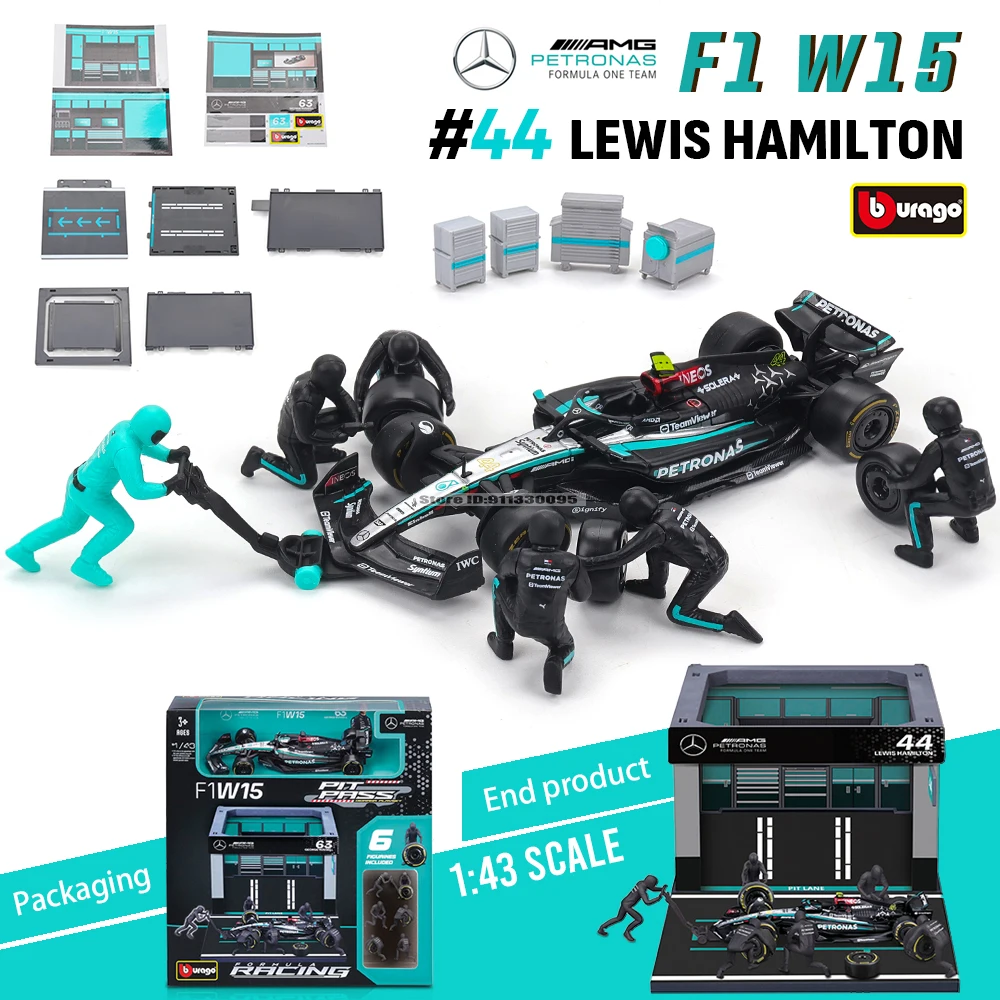 Experience the thrill of Formula 1 with this highly detailed 1:43 scale die-cast model of the 2024 Ferrari SF24 #16 driven by Leclerc. Crafted from durable metal, this finished collectible showcases sleek aerodynamic design, vibrant red livery accented with black and yellow details, and features sponsor logos such as Shell, HP, and Santander. The model includes a detailed rear wing, front wing, and exhaust components, with surrounding miniature pit stop figures dressed in red racing suits. Light and realistic accessories like spare tires and toolboxes enhance its authenticity. Presented in a foam-protected display box, this luxury collectible is perfect for enthusiasts aged 14 and above.