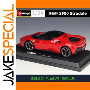 Bring home the precision and luxury of the Ferrari SF90 Stradale with this detailed 1:24 scale diecast model. Crafted from high-quality metal, this collectible replica showcases a vibrant, glossy red finish with contrasting matte black roof and upper windshield sections, capturing the sporty elegance of the original supercar. Features realistic aerodynamic curves, air vents, sharp lines, and meticulously detailed headlights, taillights, and exhaust outlets. The transparent windows reveal a finely crafted interior, while the black wheels with silver and yellow accents, textured rubber tires, and precise scale dimensions add to its authentic appearance. Elevate your collection with this sophisticated, non-electric, alloy model designed for adult enthusiasts.