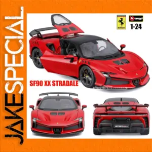 - High-quality, authentic die-cast metal construction in vibrant red, capturing the true essence of the Ferrari SF90 XX Stradale’s sporty aesthetics with glossy, durable paint finish.
