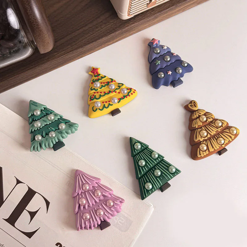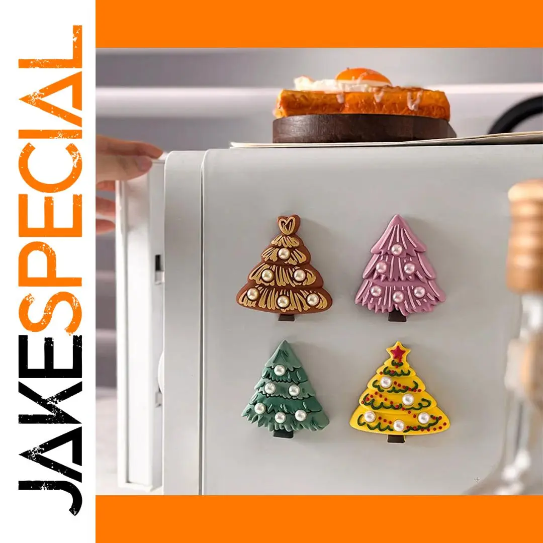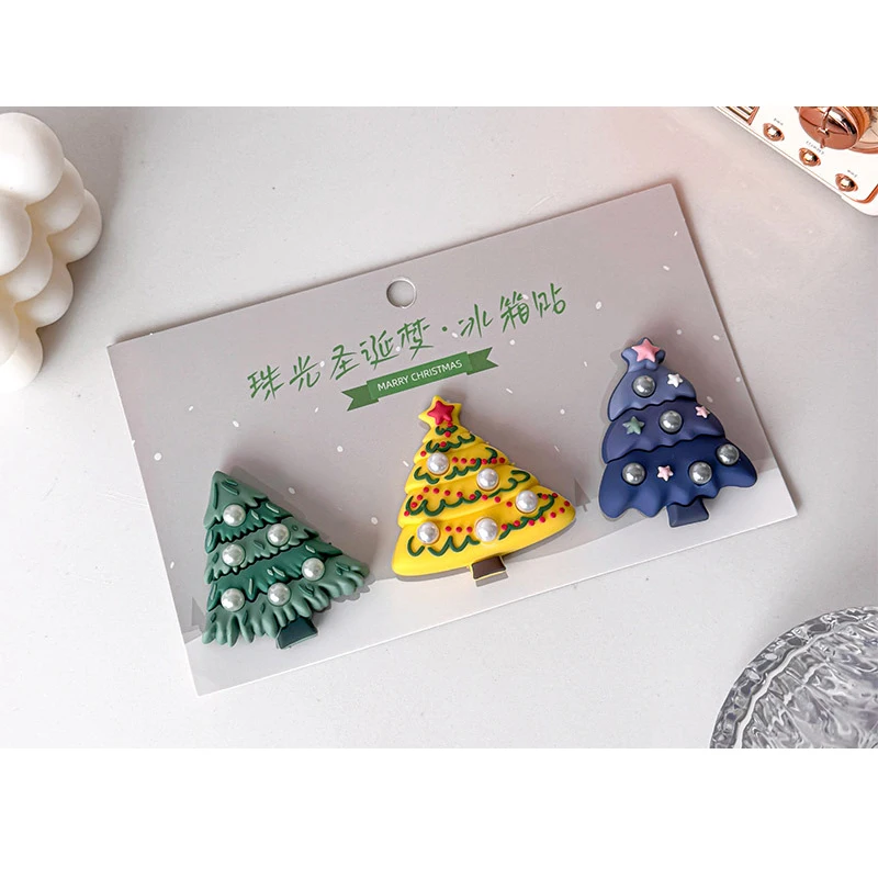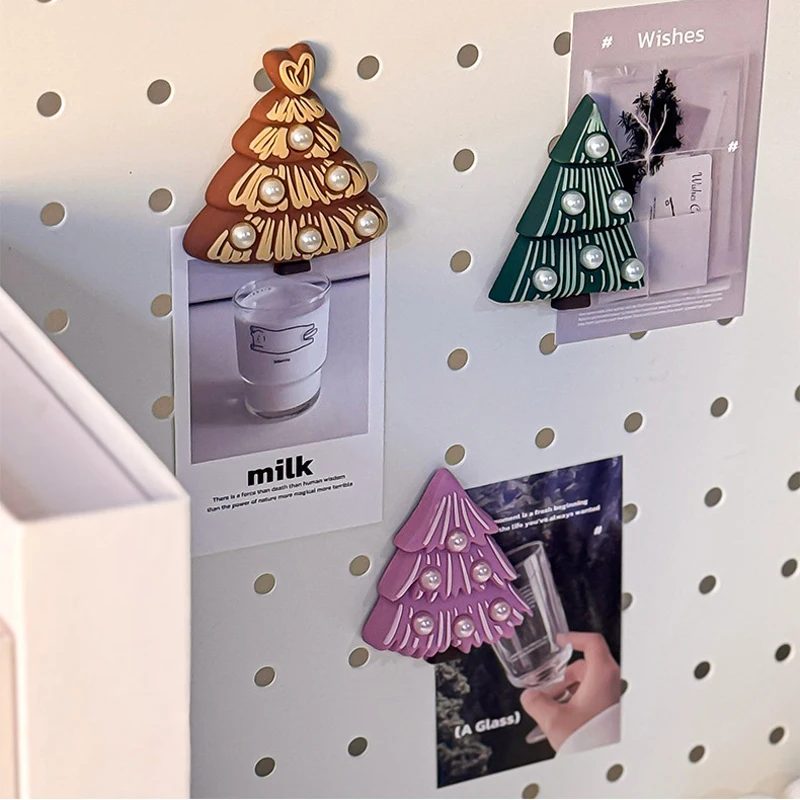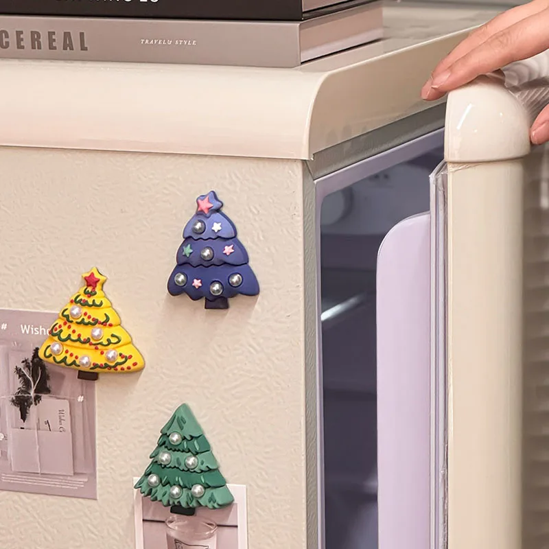 - Includes three stylized 3D Christmas tree magnets in vibrant festive colors—brown, pink, green, and yellow—each with decorative pearl-like ornaments for a lively holiday look.