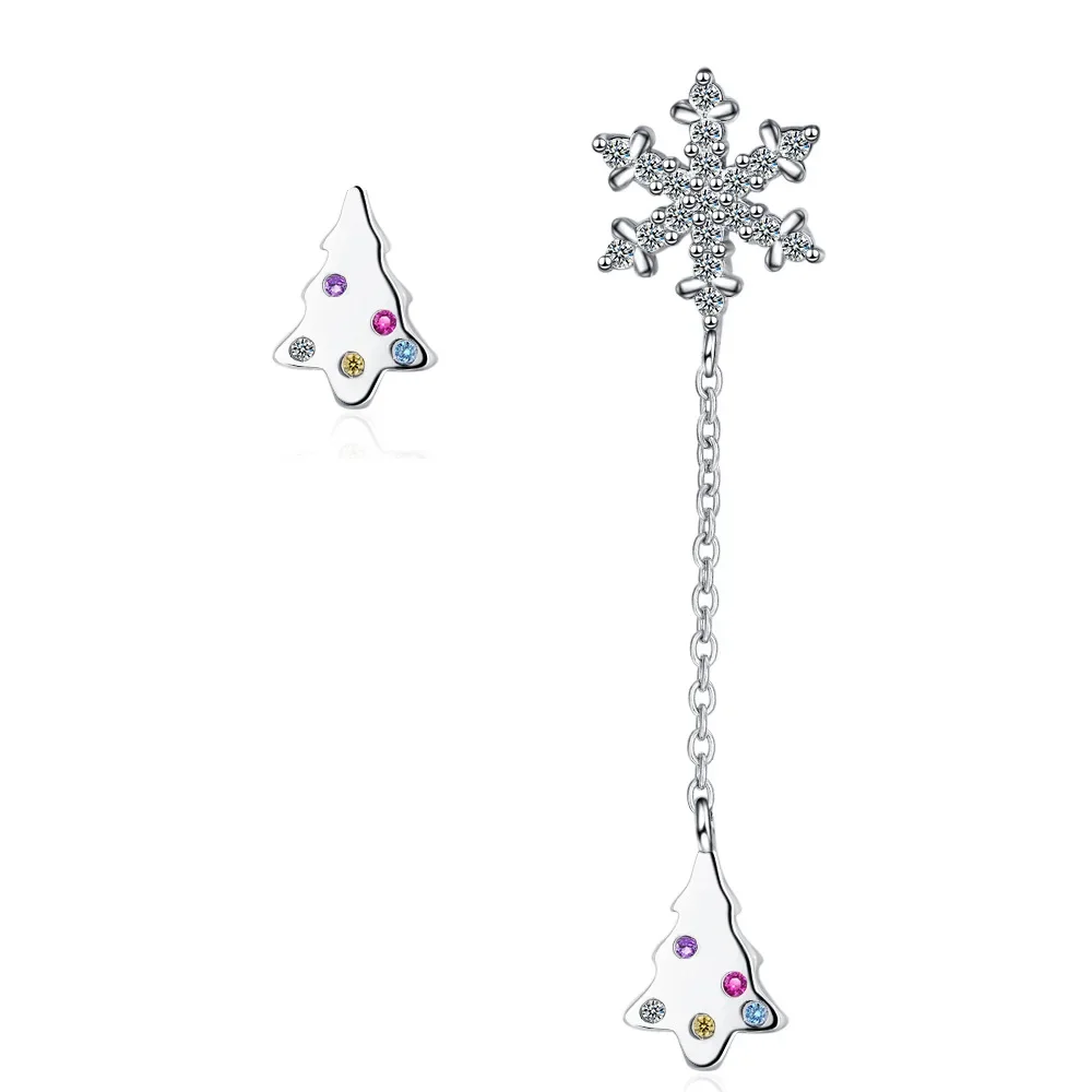 Celebrate the holiday season with this stunning pair of asymmetric snowflake earrings designed for women who love festive and trendy jewelry. Crafted from high-quality 925 sterling silver with a polished silver color finish, these earrings showcase intricate craftsmanship and eye-catching details. One earring features a delicate snowflake adorned with sparkling zircon stones and crystal accents that mimic the delicate branches of a snowflake, adding a touch of winter magic. The other presents a smooth, stylized Christmas tree outline embedded with vibrant, multicolored round stones in pink, purple, yellow, and black, creating an eye-catching contrast. A dangling chain from the snowflake adds movement and elegance, culminating with a small star shape, perfect for holiday celebrations or gifting. Lightweight and refined, these earrings weigh approximately 1 gram, making them comfortable for all-day wear. Their geometric, trendy aesthetic makes them suitable for anniversaries, engagements, or special occasions that require a stylish yet festive accessory.