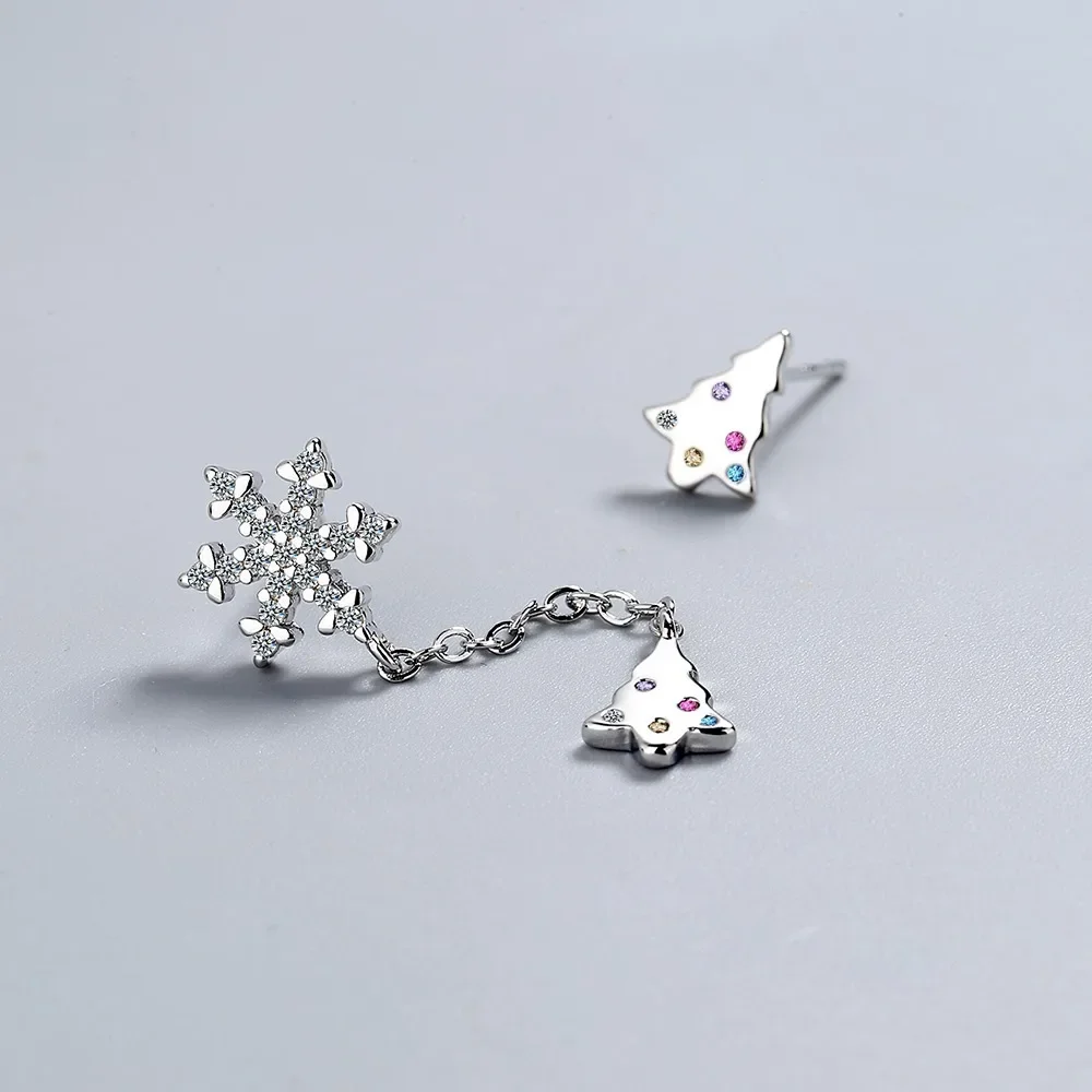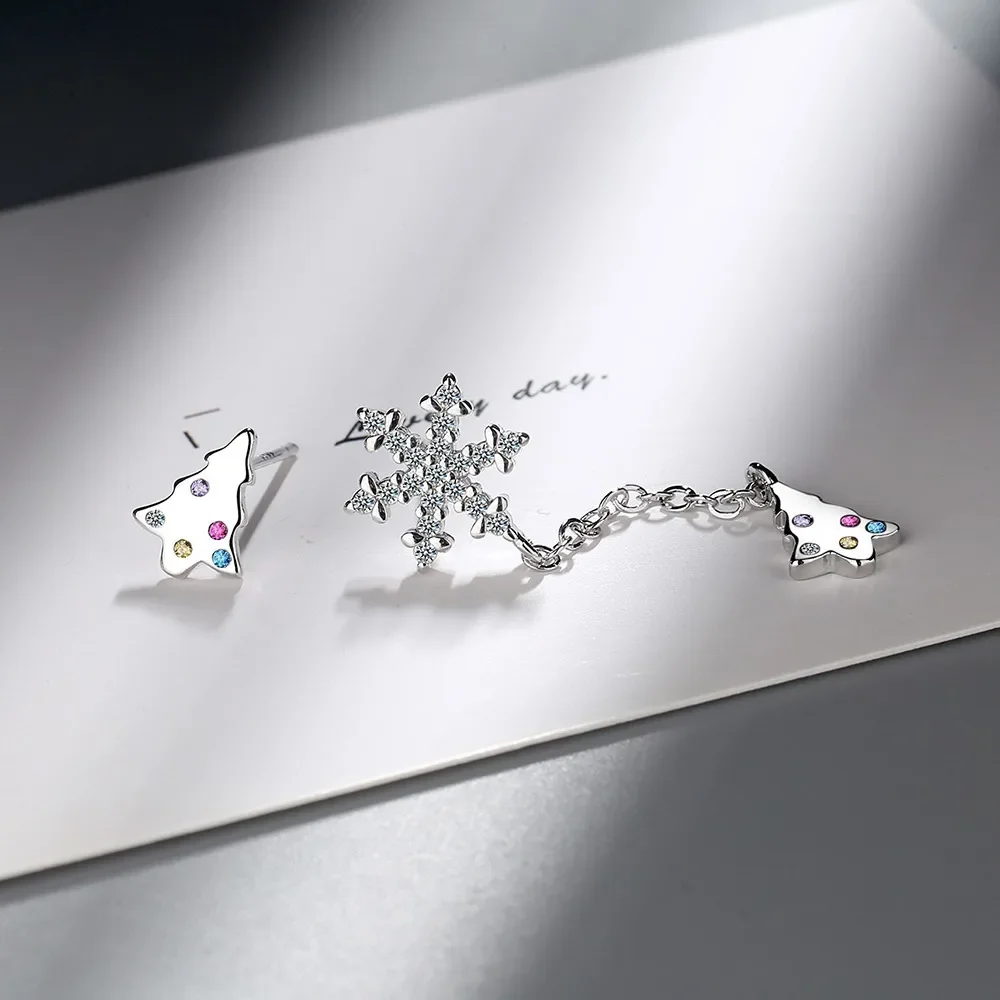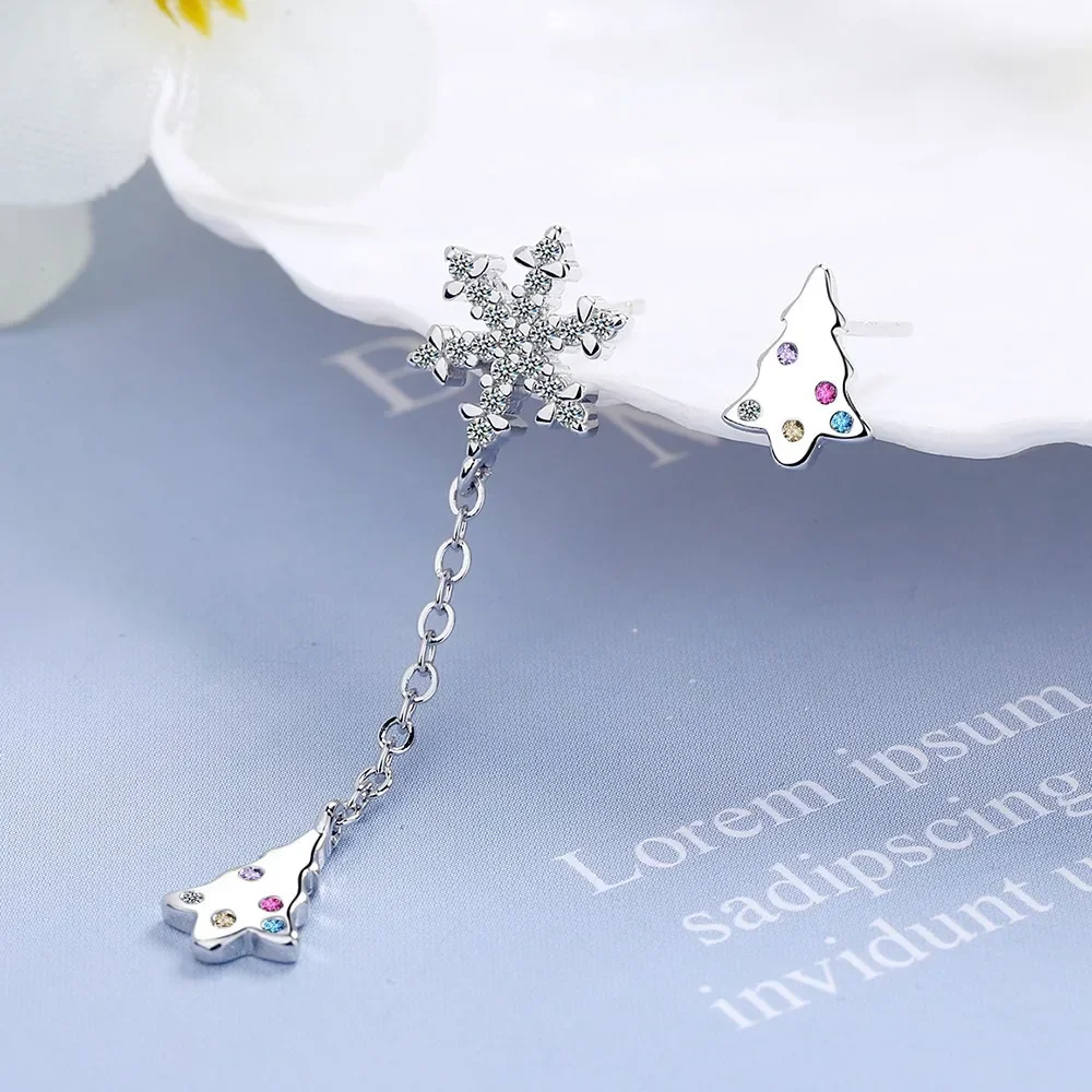 - One earring displays a detailed snowflake with zircon stones and crystal accents, capturing the intricate beauty of winter, while the other has a stylized Christmas tree outline with colorful round stones.