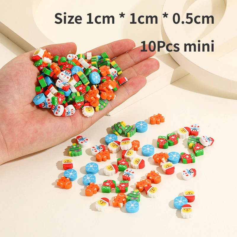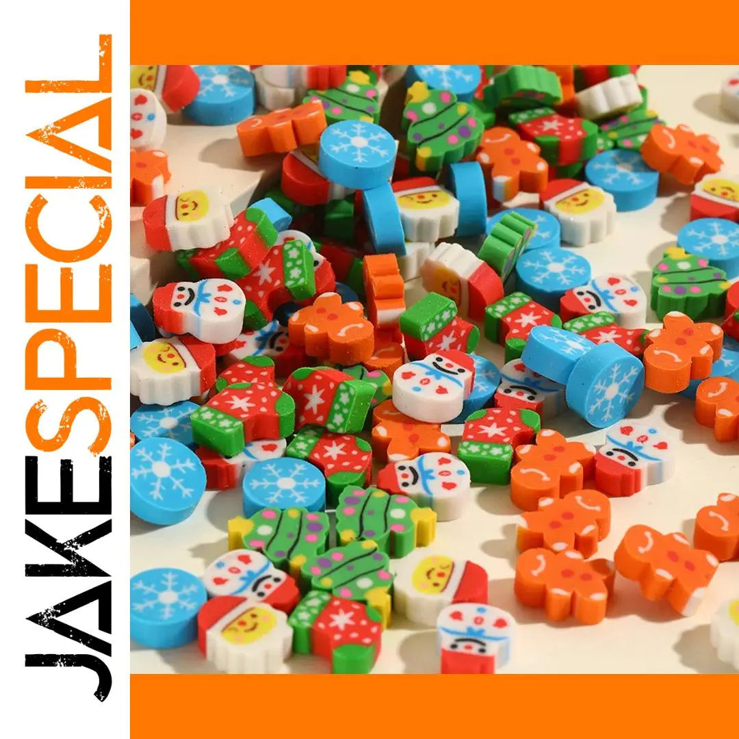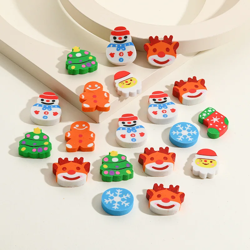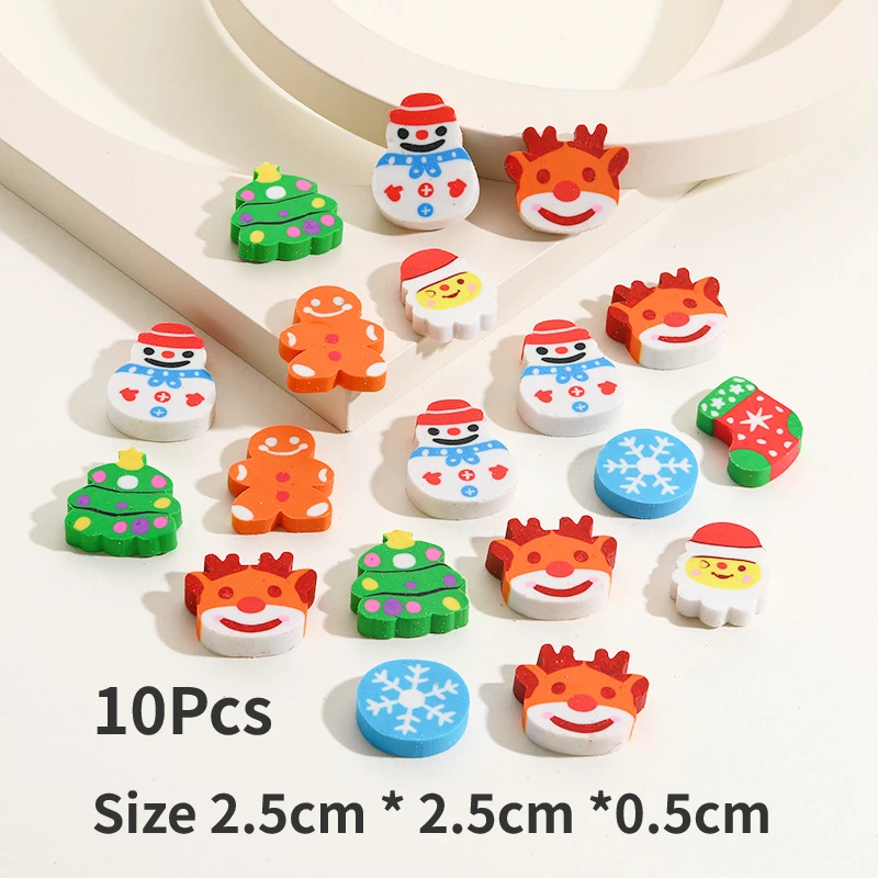 - Includes 10 cartoon-themed plastic erasers, featuring Christmas trees, Santa, snowmen, gingerbread men, and snowflakes, in vibrant colors like red, green, white, blue, orange, and yellow.