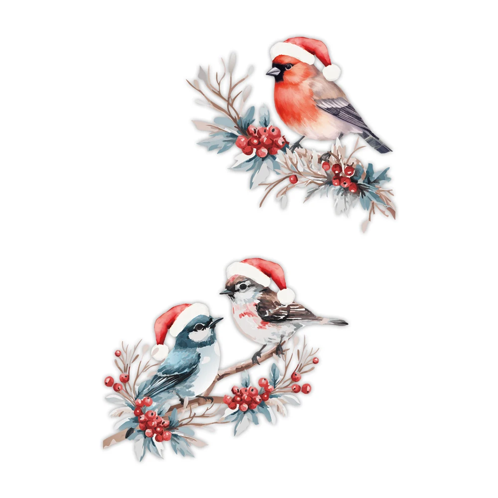 - This waterproof static sticker features three beautifully detailed birds with naturalistic shades of gray, black, white, brown, and pink, wearing vibrant red Santa hats, perfect for holiday cheer.