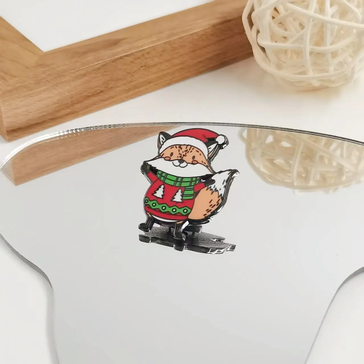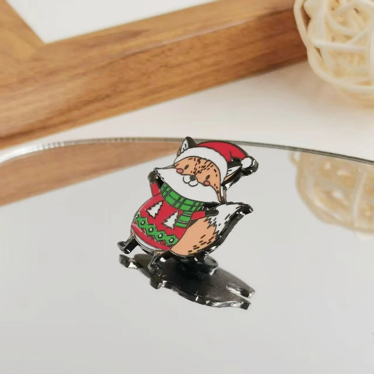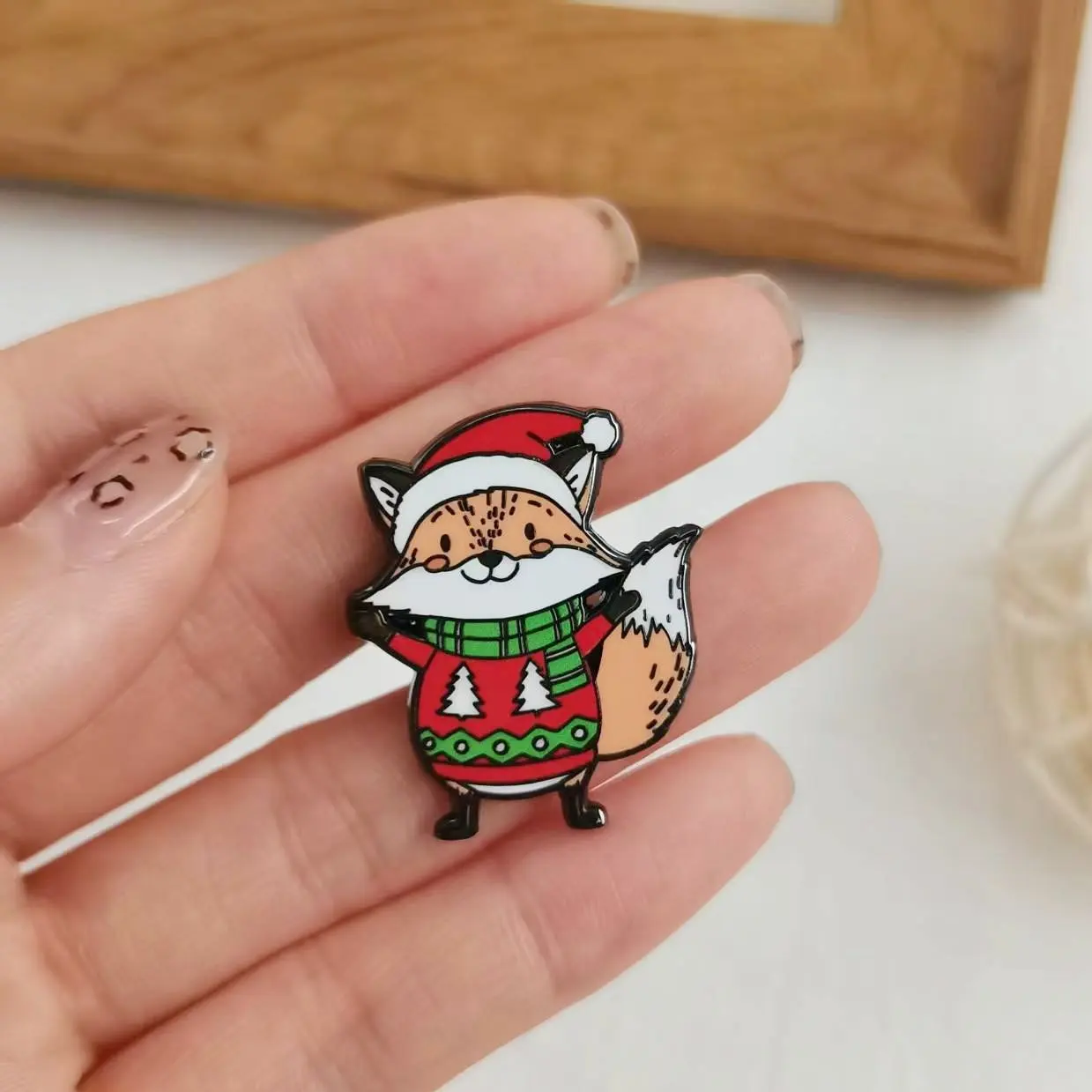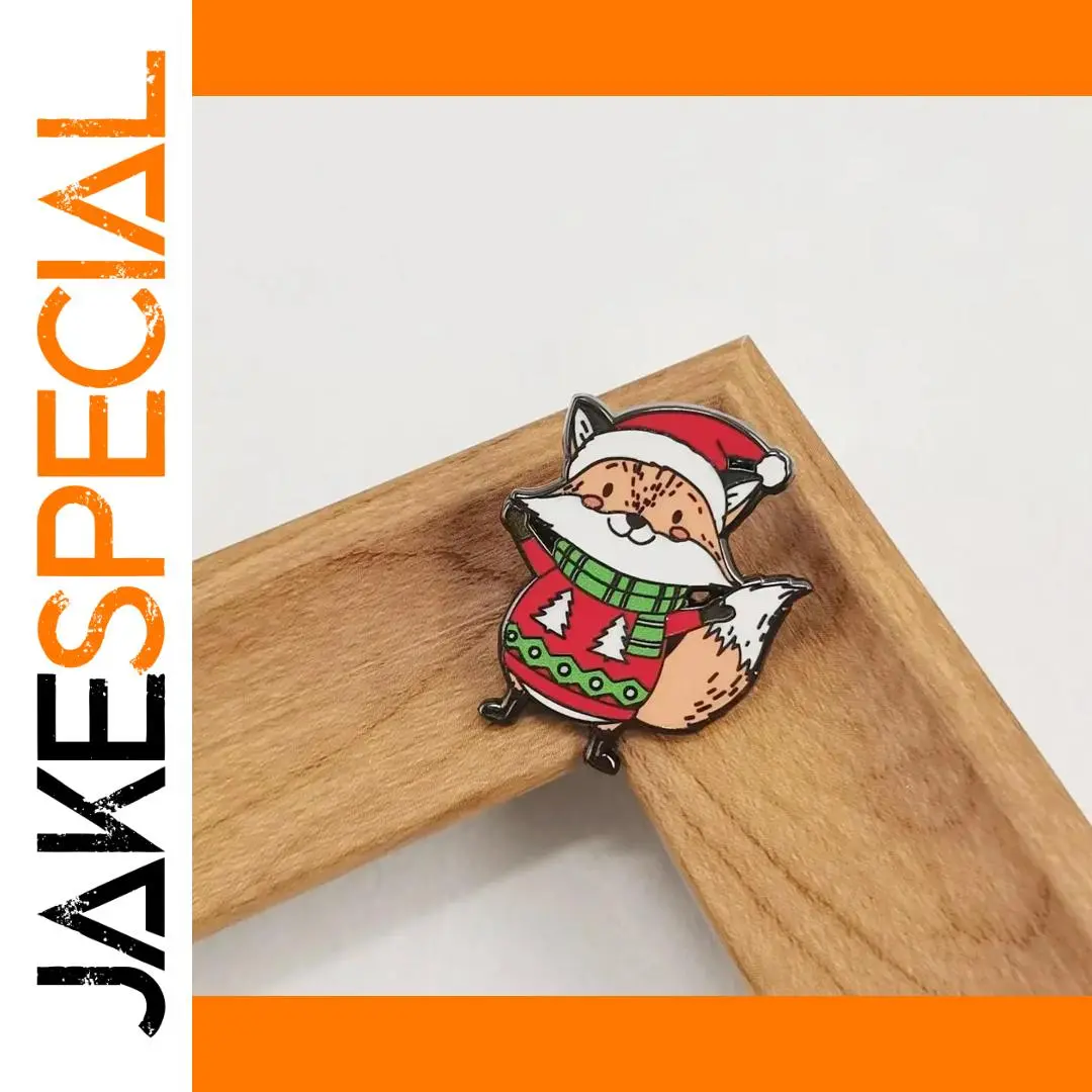 Transform your holiday wardrobe with this adorable Christmas-themed fox lapel pin. Crafted from durable metal with a smooth enamel finish, it showcases a cheerful cartoon fox dressed in a red Santa hat with a fluffy white pom-pom and a green plaid scarf. The fox's light orange and beige fur, dotted cheeks, and fluffy bushy tail add a whimsical and cozy touch. Its vibrant colors and retro, nostalgic style make it perfect for seasonal wear or as a charming gift. The well-defined edges and bright accents highlight its playful personality, allowing you to add a warm, festive flair to jackets, hats, or bags, creating a joyful atmosphere wherever you go during the holiday season.