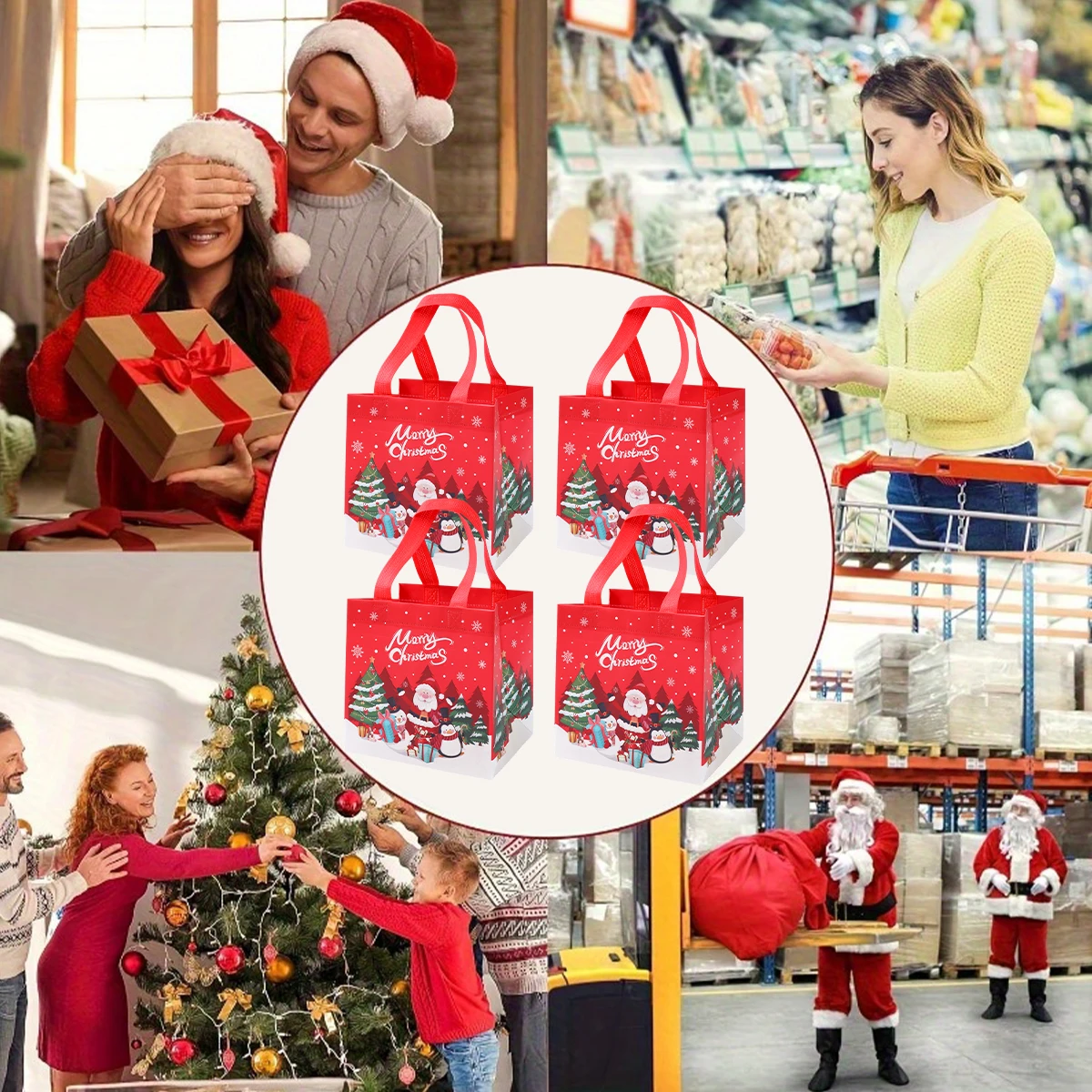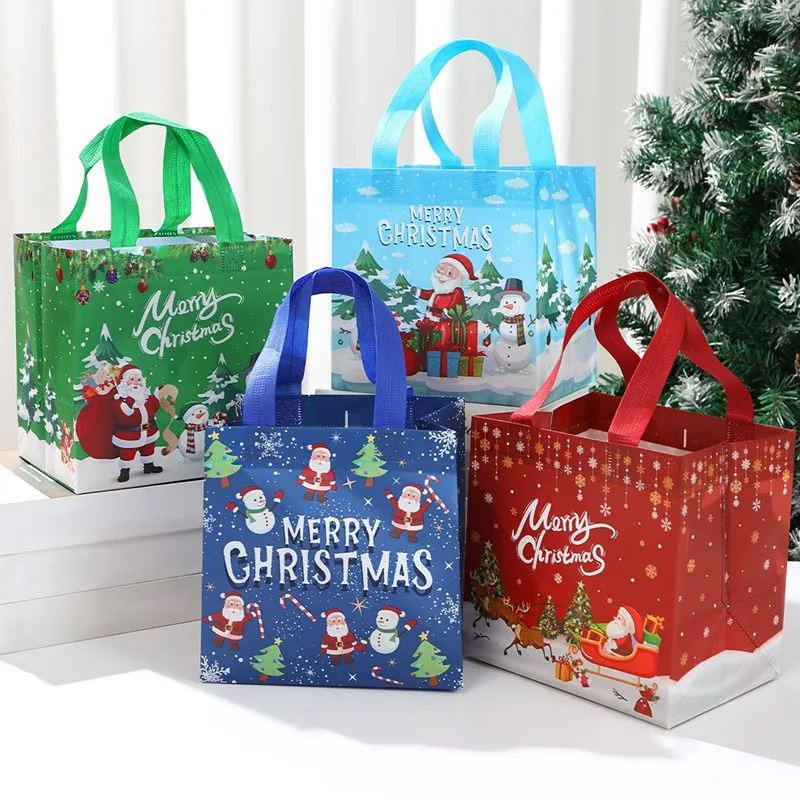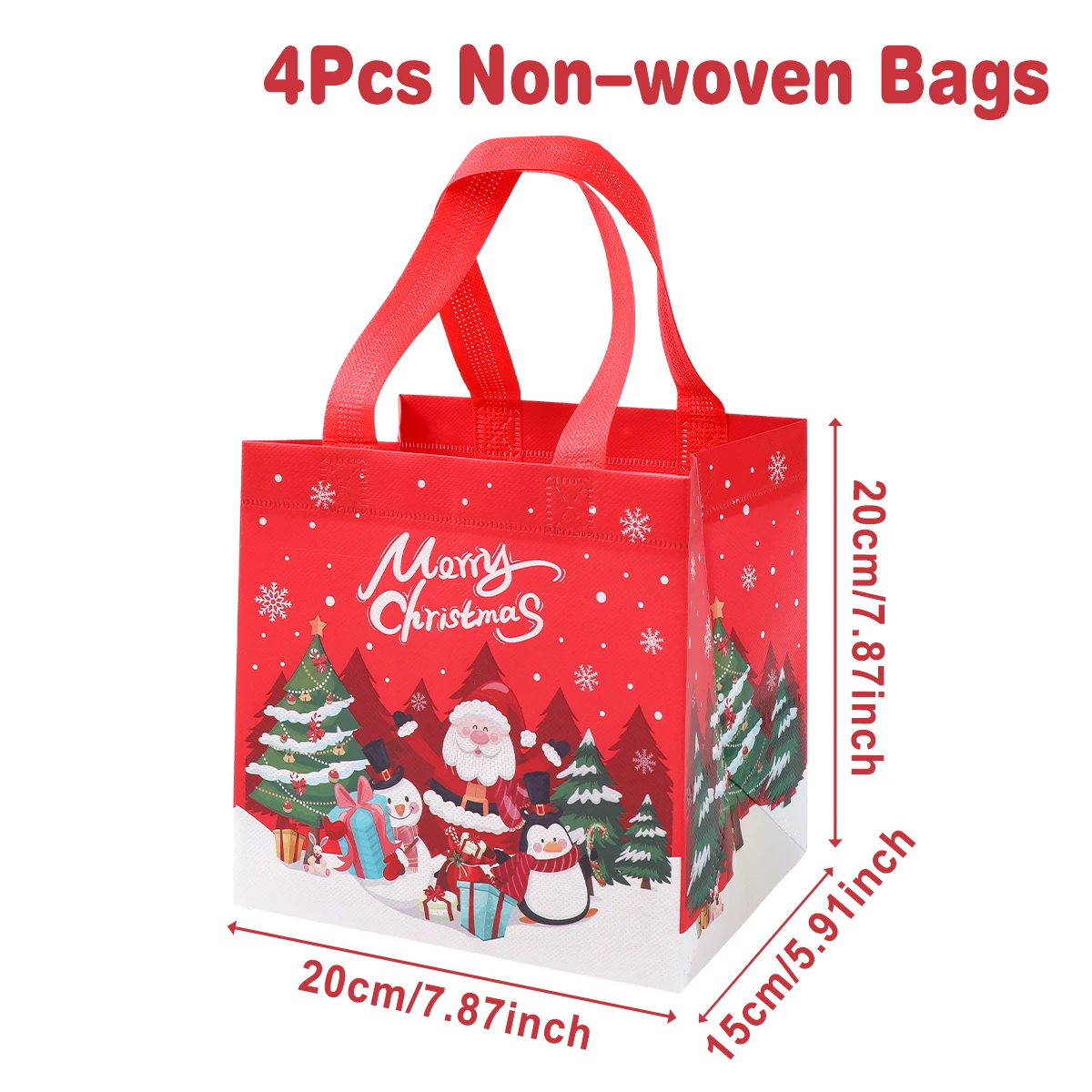 Celebrate the holiday season with this set of four festive Christmas-themed gift bags, available in two vibrant color options: Bag A and Bag B. Crafted from durable non-woven fabric, these lightweight yet sturdy bags feature colorful, detailed illustrations of Santa Claus, snowmen, Christmas trees, presents, and festive snowflakes, creating a cheerful holiday atmosphere. Each bag displays the phrase “Merry Christmas” in elegant white cursive at the top, complementing the lively design. The sturdy woven handles offer easy carrying, while the open-top style provides practicality for gifting or decoration. Perfect for enhancing your Christmas celebrations and creating memorable gift presentations.