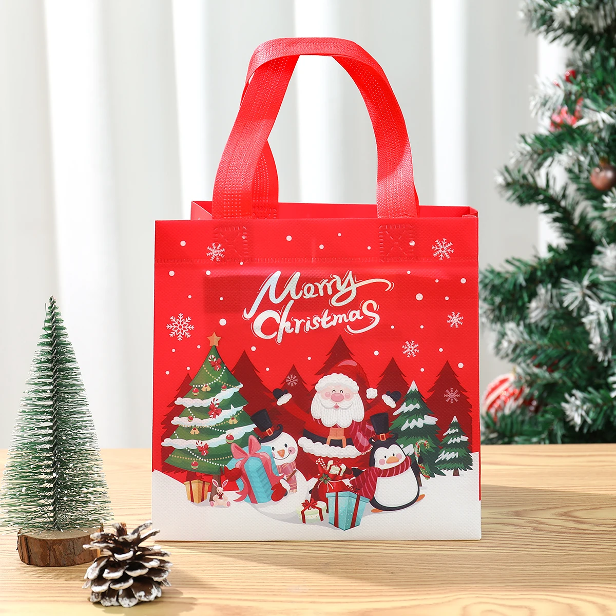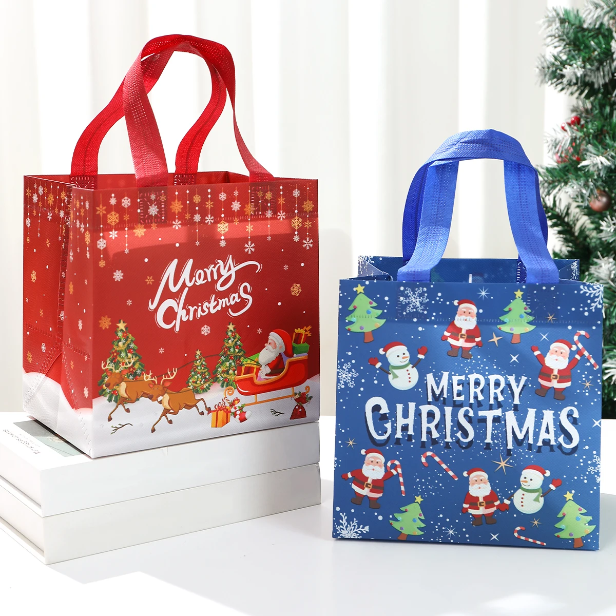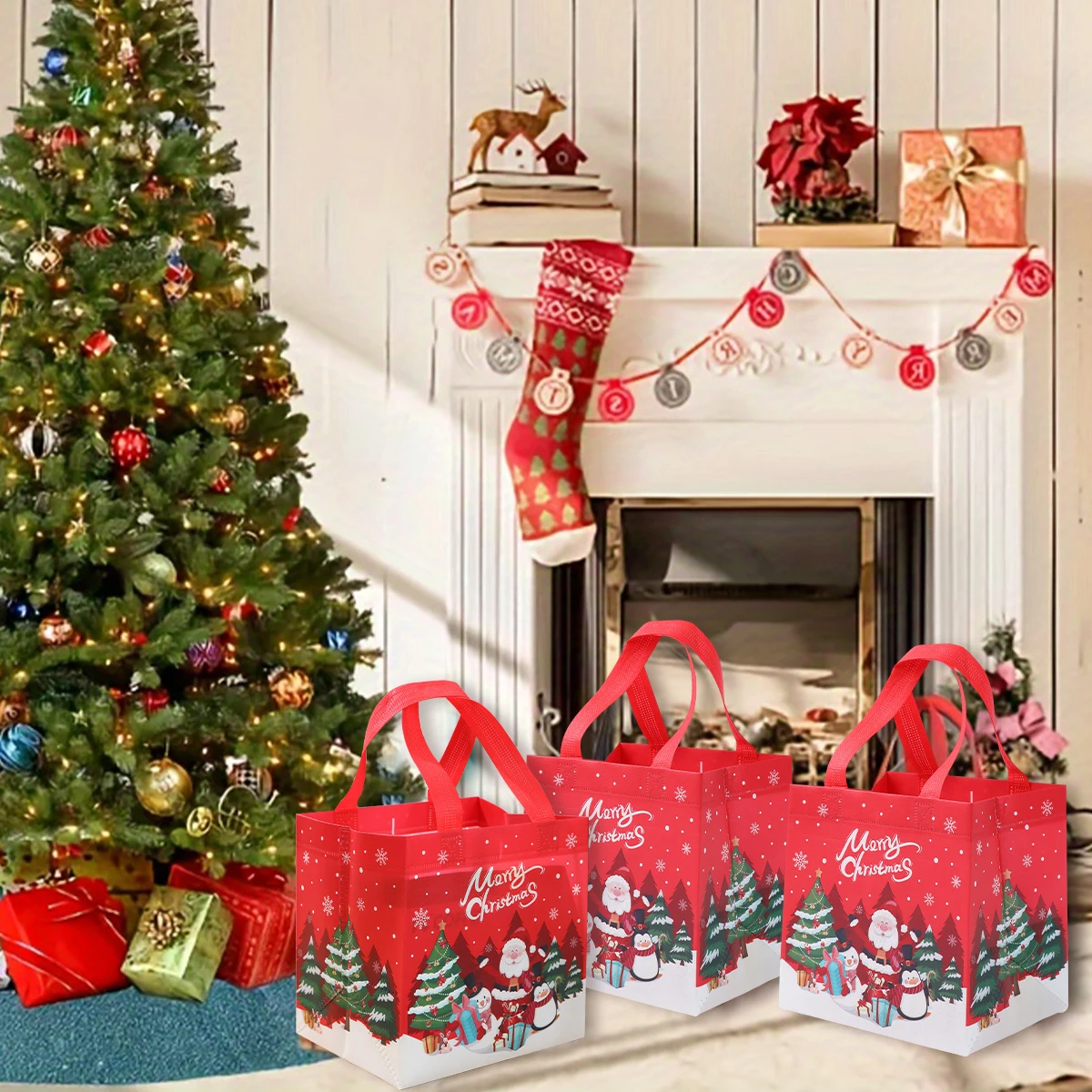 Celebrate the holiday season with this set of four festive Christmas-themed gift bags, available in two vibrant color options: Bag A and Bag B. Crafted from durable non-woven fabric, these lightweight yet sturdy bags feature colorful, detailed illustrations of Santa Claus, snowmen, Christmas trees, presents, and festive snowflakes, creating a cheerful holiday atmosphere. Each bag displays the phrase “Merry Christmas” in elegant white cursive at the top, complementing the lively design. The sturdy woven handles offer easy carrying, while the open-top style provides practicality for gifting or decoration. Perfect for enhancing your Christmas celebrations and creating memorable gift presentations.