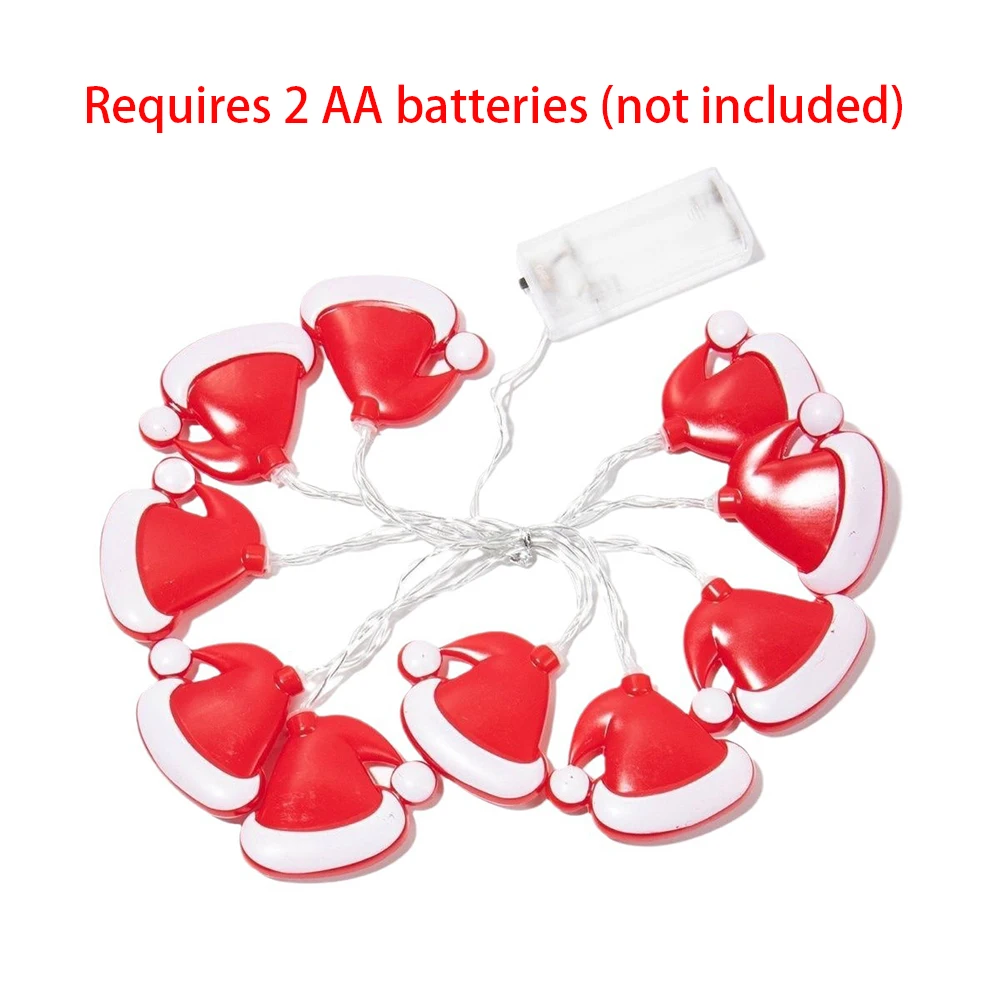 Transform your holiday decor with this delightful string of Christmas-themed LED lights. Measuring either 1.5 meters or 3 meters, this versatile decoration features small, festive bulbs shaped like Santa hats, stockings, and candy canes, arranged along delicate metallic wiring. The vibrant red, white, and green colors create a warm, inviting glow, perfect for indoor or outdoor settings. When illuminated, the glossy finishes and charming motifs evoke holiday cheer and nostalgia, making your space more festive. Easy to drape over mantels, trees, or around windows, these lights instantly enhance your Christmas atmosphere. Powered by 2 AA batteries (not included), they offer cordless convenience and safe outdoor use. Add a cozy, vibrant touch to your holiday celebrations with this enchanting string of LED lights.