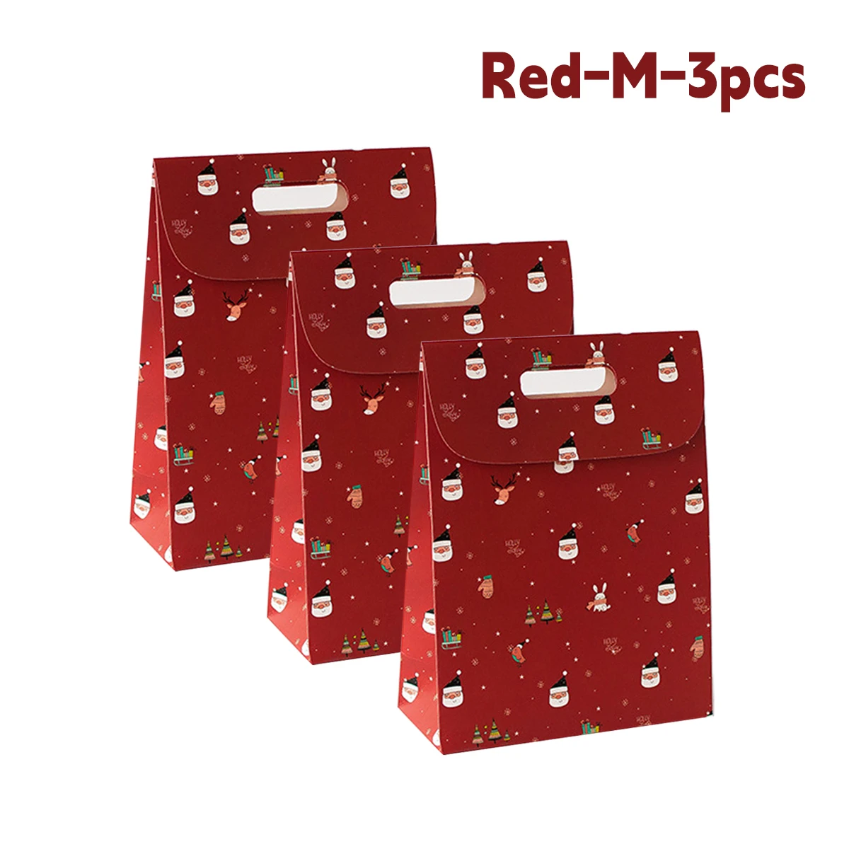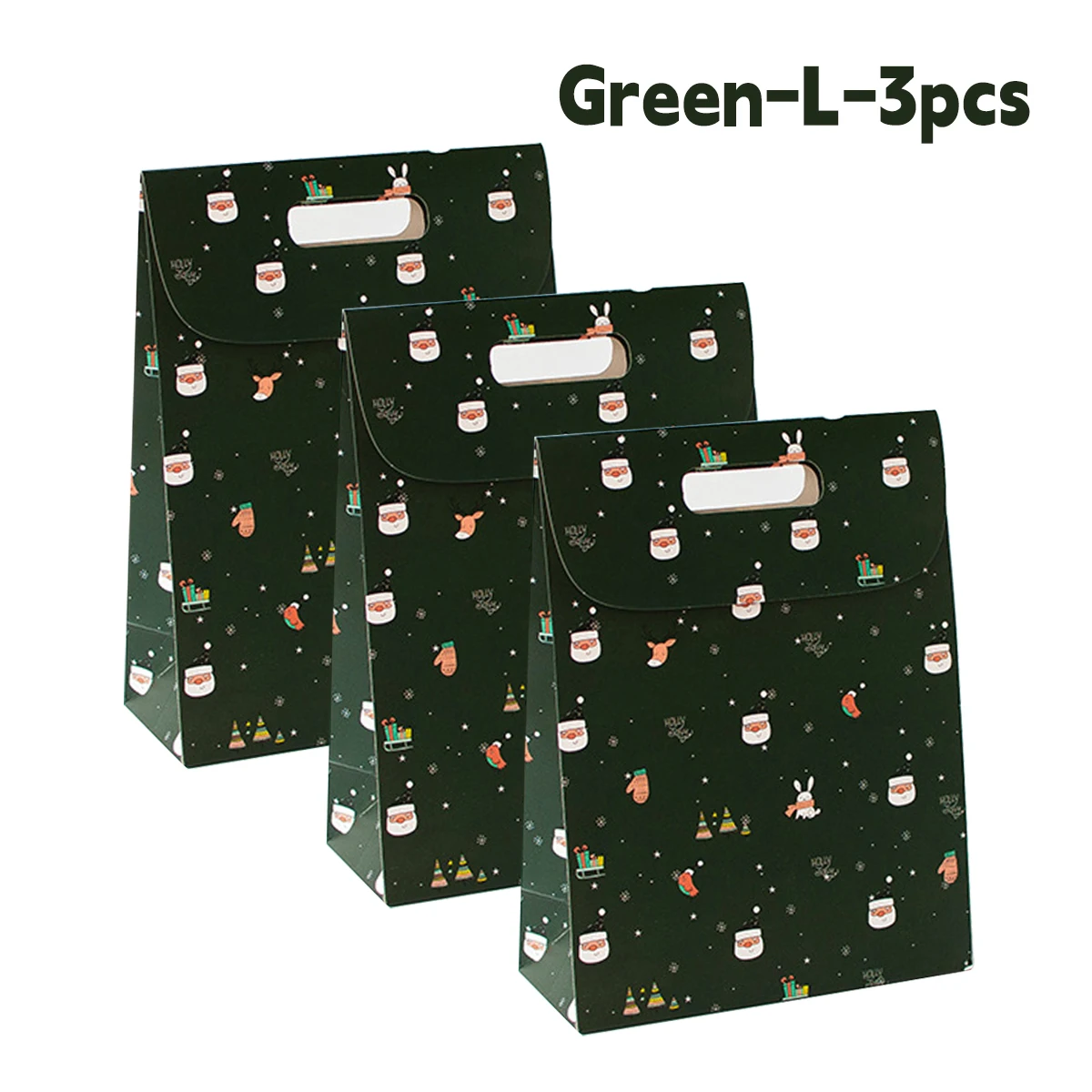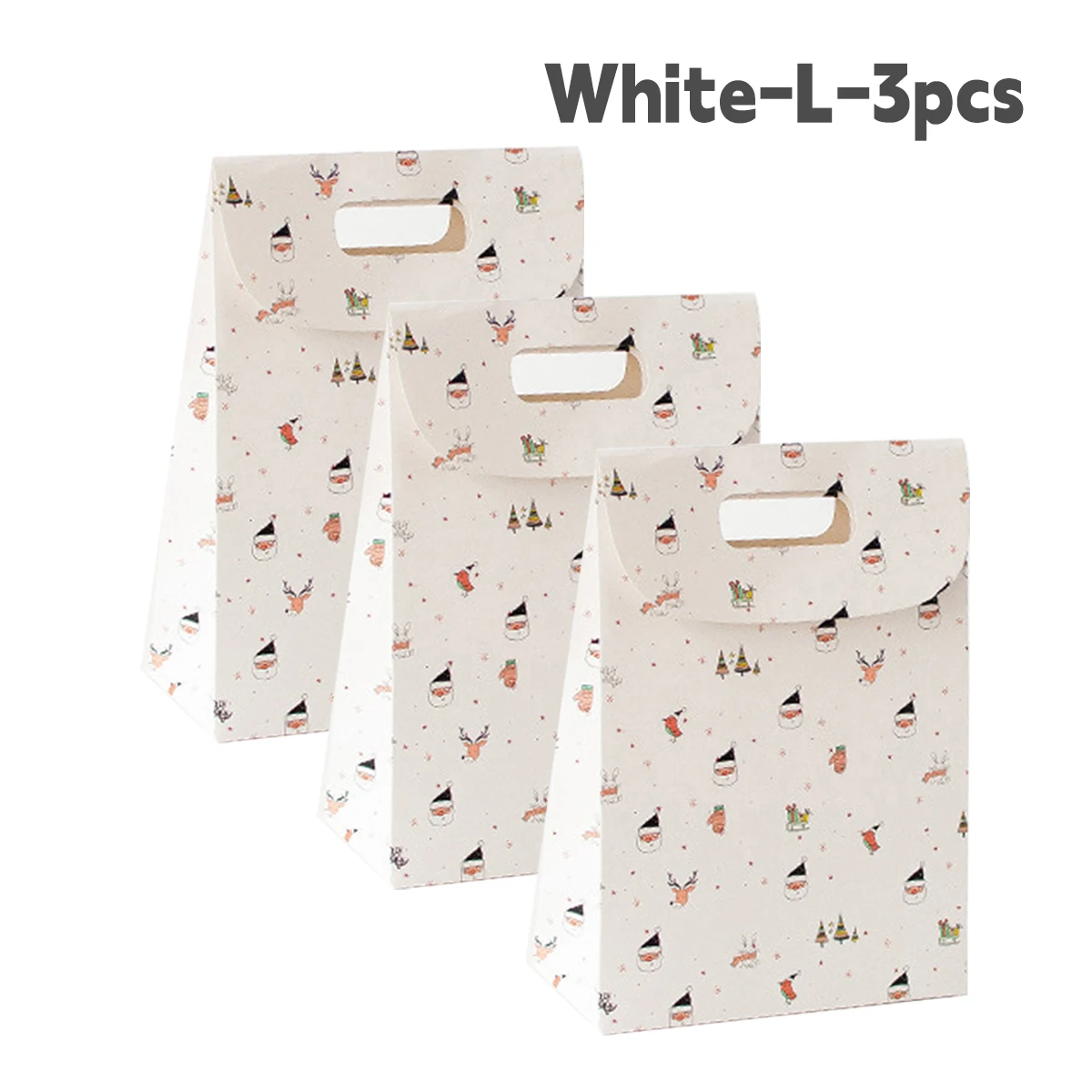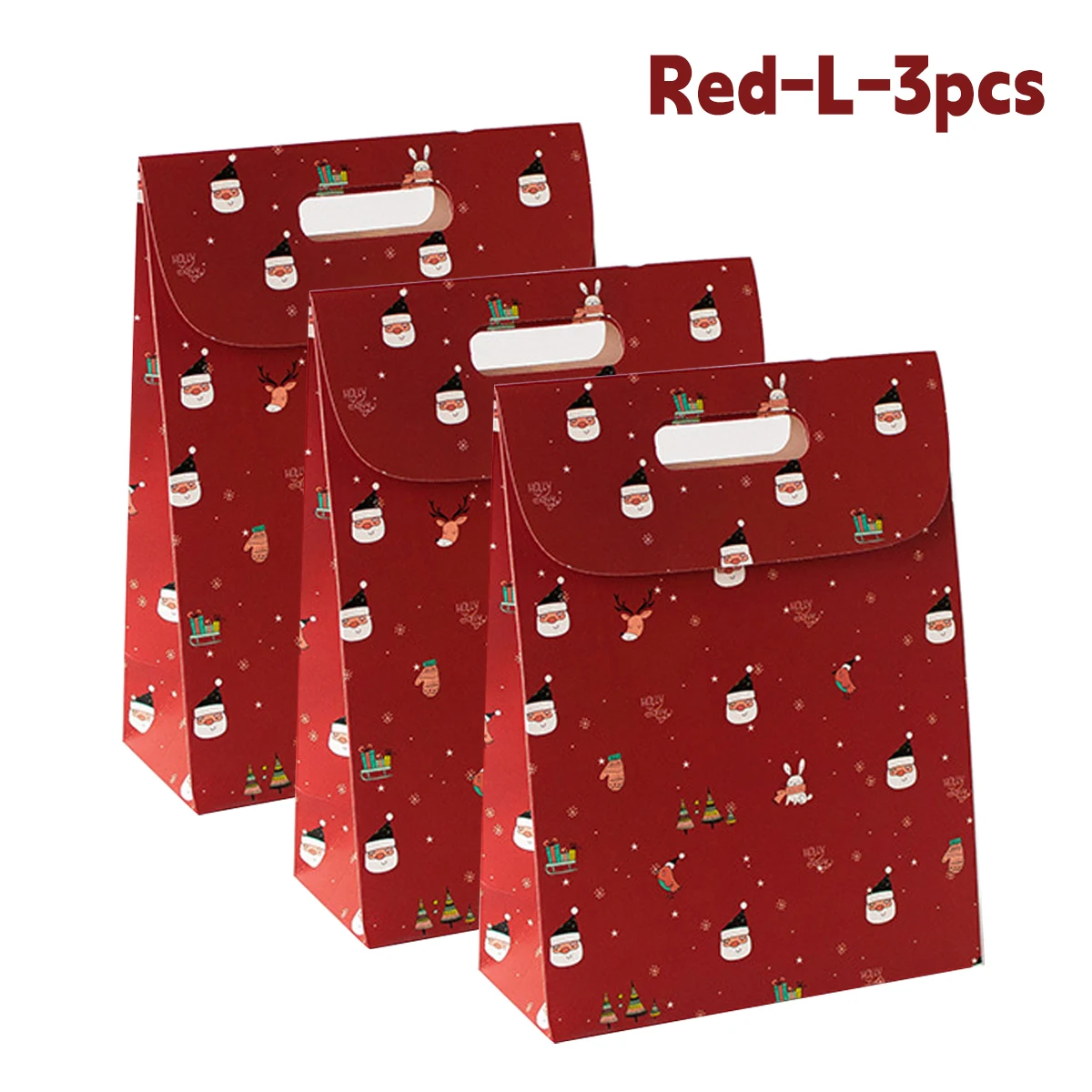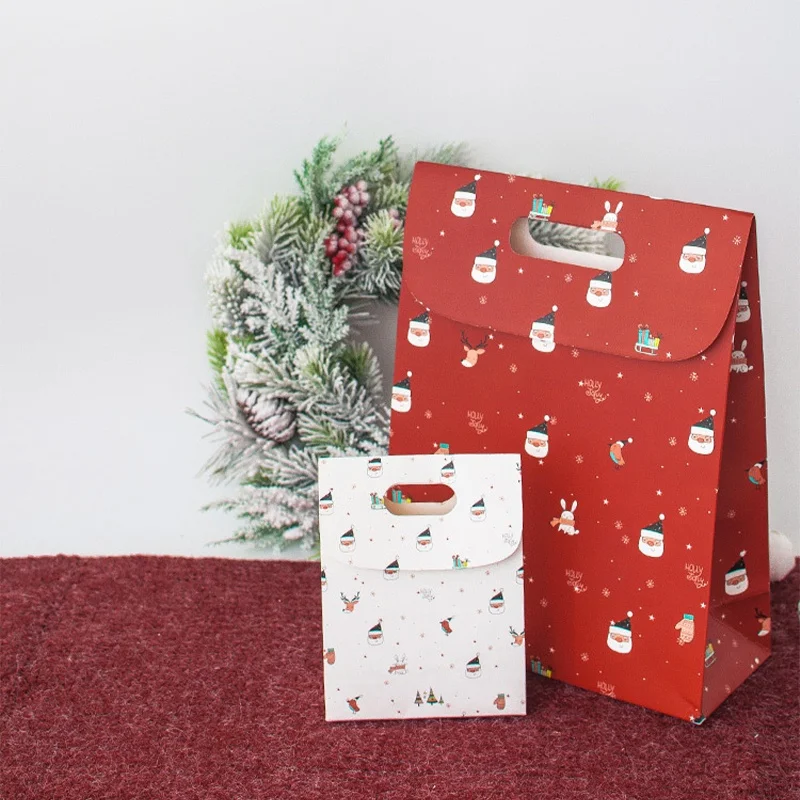 Imagine elevating your holiday gifting with this charming, flip-style paper gift bag available in three sizes—S, M, and L—each measuring 19x24cm. Designed with vibrant colors and cheerful patterns, these bags are perfect for Christmas Eve, parties, or New Year celebrations. The red bag features playful cartoon Santa Claus, reindeer, Christmas trees, and gift box motifs, creating a lively holiday atmosphere. The white bag showcases cute illustrations of Santa faces, snowflakes, and reindeer, offering a crisp classic look. The green bag presents similar festive symbols, bringing a cozy, traditional vibe. Crafted from smooth paper without harmful chemicals, these lightweight yet sturdy bags include a handle for easy transport, making your gift-giving joyful and effortless.