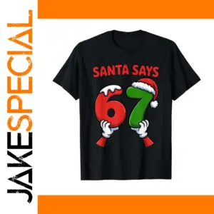 - The stylish graphic design showcases “SANTA SAYS” with colorful 6 and 7 numbers, accented with Santa hats and snow details for a festive look.