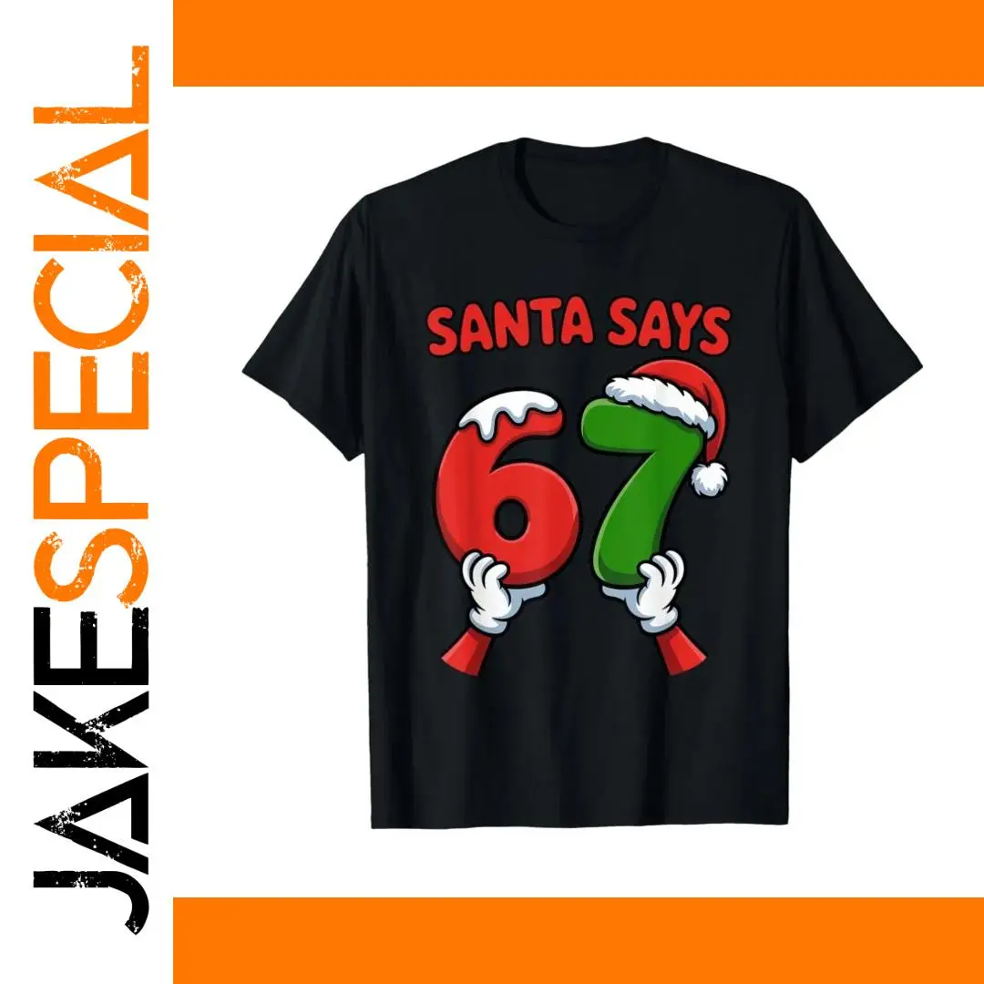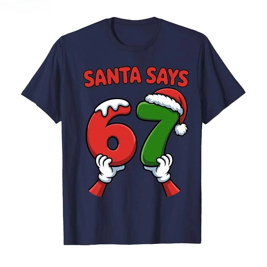 Imagine yourself celebrating the holiday season in this lively black T-shirt, designed to bring joy and cheer to your casual wardrobe. Crafted from soft, breathable 100% cotton, it ensures comfort whether you're at a family gathering or out holiday shopping. The playful graphic features bold red “SANTA SAYS” lettering, with colorful stylized numbers “6” in red with snow details and “7” in green with a Santa hat, surrounded by cheerful white-gloved hands. Its lightweight, knit fabric makes it perfect for year-round wear, and a range of sizes ensures a great fit for everyone. You can enjoy this easy-to-wear, fun design that radiates holiday spirit and makes a memorable impression.
