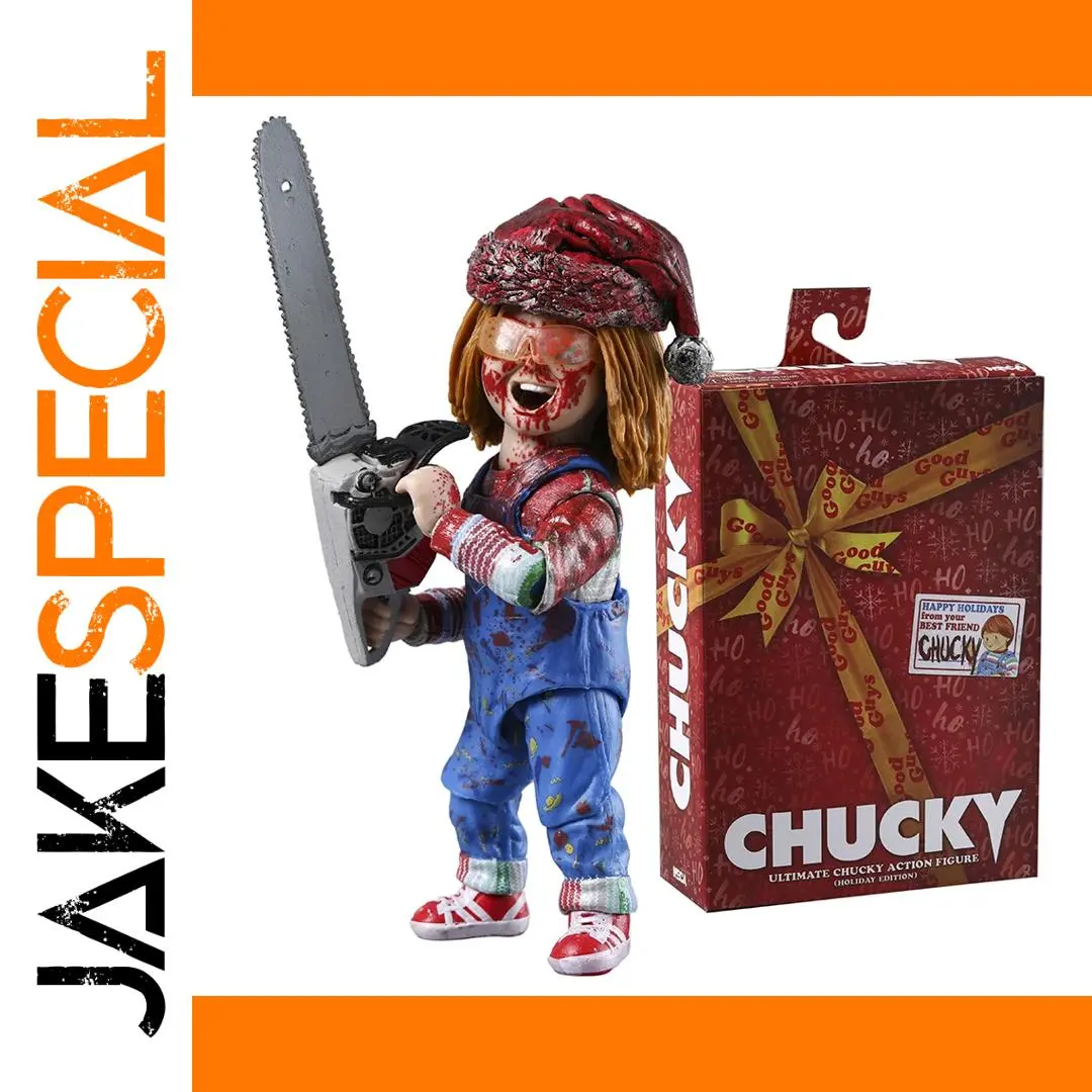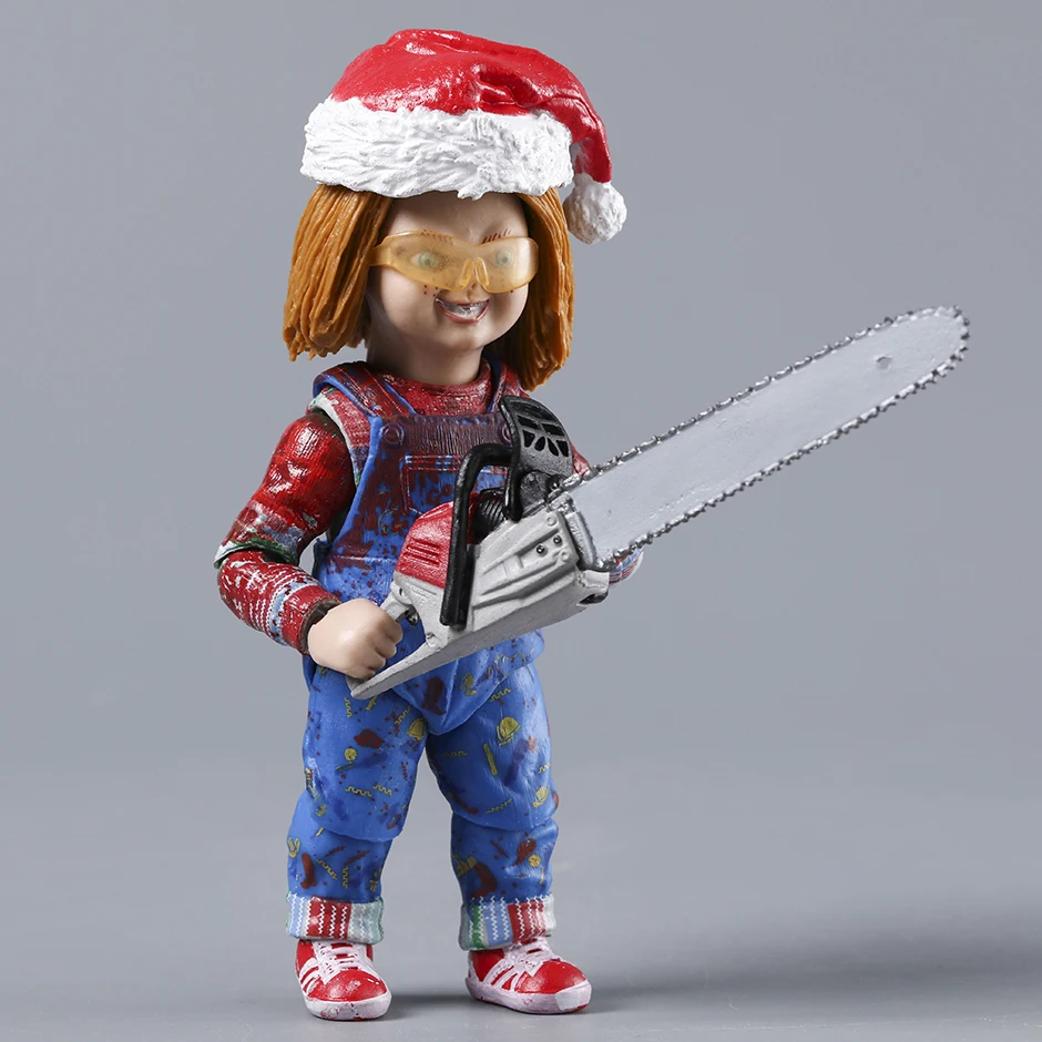 Step into the spooky season with this exclusive holiday edition of the this Chucky TV Series Ultimate Chucky action figure. Standing approximately 10.5 centimeters tall, this PVC collectible blends holiday cheer with a sinister twist. Dressed in a bloodstained, striped shirt paired with worn blue overalls, Chucky exudes a mischievous yet menacing vibe. His long, messy orange hair, blood-splattered Santa hat with a white pom-pom, and dirt-streaked sneakers add to his rugged appeal. The figure holds a detailed gray and black chainsaw, enhancing its edgy aesthetic. Perfect for display or as a gift, this model fuses holiday themes with horror, making it a unique addition to any collection. Its durable design ensures it’s a standout piece in any collection.