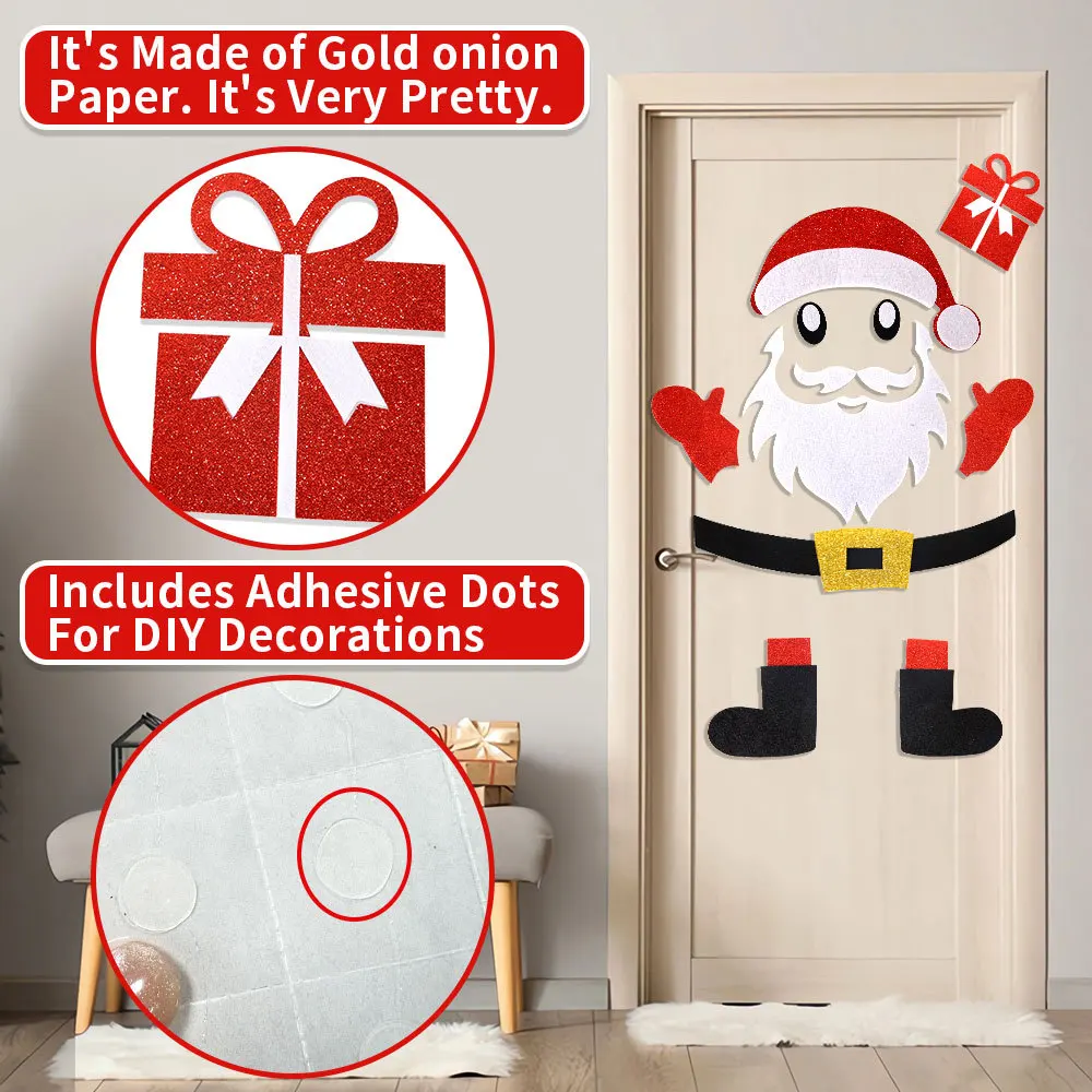 - Made from premium felt cloth, these stickers are soft, durable, and easy to handle for festive decoration. They feature vibrant colors like red, green, gold, and white with glittery accents for extra sparkle.