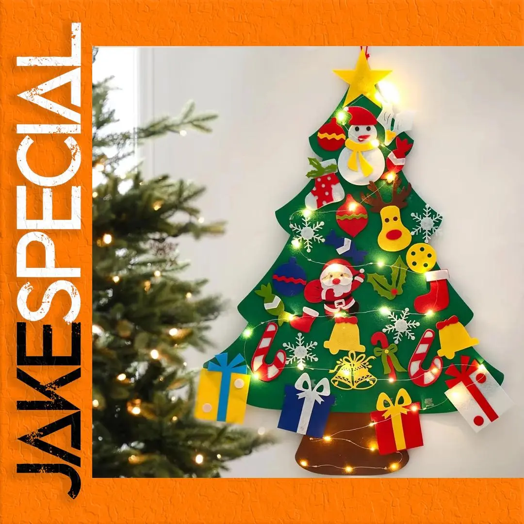 Imagine transforming your home into a festive wonderland with this beautiful felt Christmas tree. Crafted from soft cloth material, this colorful and playful decoration features a layered, flat silhouette resembling a traditional pine tree, perfect for adding warmth and cheer to your holiday decor. Adorned with vibrant felt ornaments of snowmen, reindeer, Santa Claus, stockings, bells, snowflakes, candy canes, holly, and gift boxes, it creates a lively Christmas scene. Bright LED lights outline the tree, enhancing the cheerful glow that welcomes your family and guests. Easy to assemble and display, this decoration offers a cozy, handcrafted aesthetic that captures the spirit of Christmas and is ideal for creating memorable holiday moments at home or as a thoughtful gift.