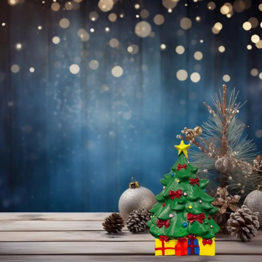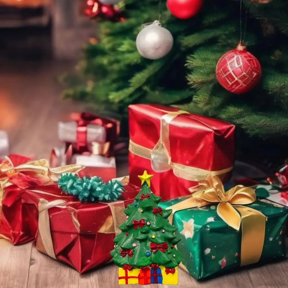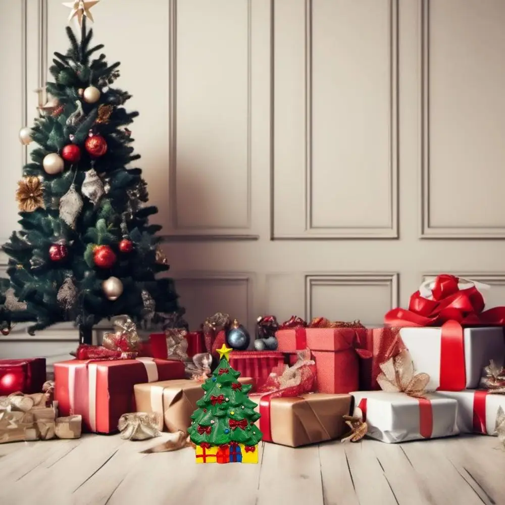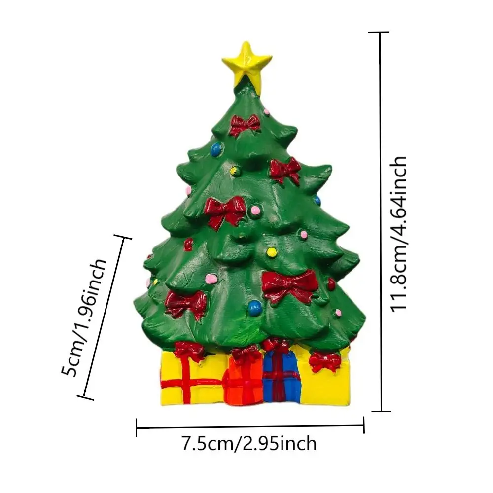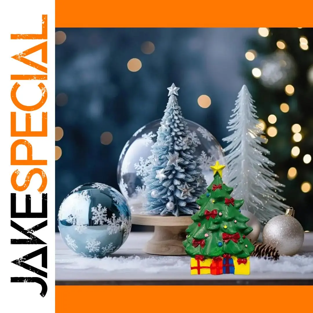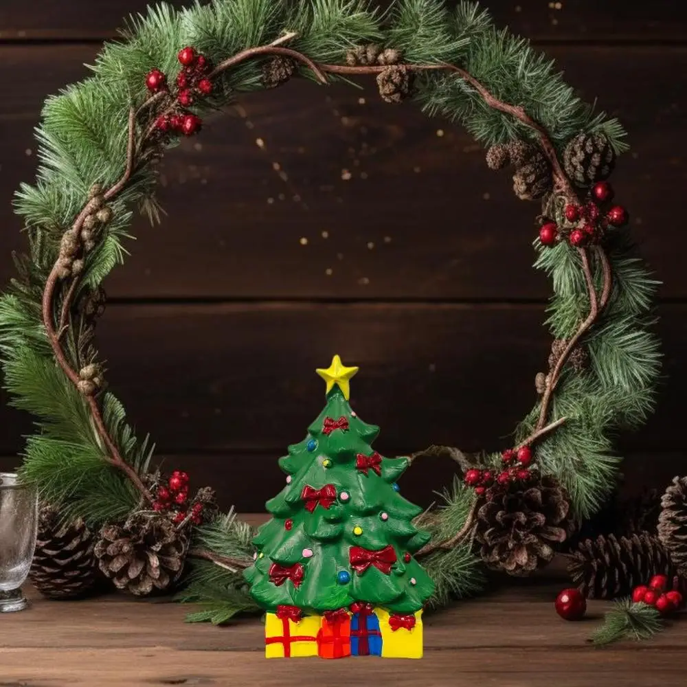 Add a touch of festive charm with this small, green resin Christmas ornament featuring rich colors and an elegant design. Perfect for tabletop or home decorations, it embodies themes of love, hope, and family reunion, making it an ideal decorative gift. Its vibrant appearance is adorned with tiny red bows, multicolored spherical ornaments, and topped with a bright yellow star, while accompanying white, spiky pine tree-shaped decorations evoke a natural wintery scene. Complemented by shiny silver baubles with white snowflake patterns and a glittery silver ornament, this ornament creates a warm, holiday atmosphere. Crafted from durable resin with regional European influences, it elevates any Christmas setting with its lively, colorful, and sparkling aesthetic.