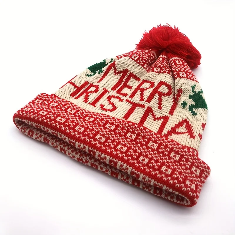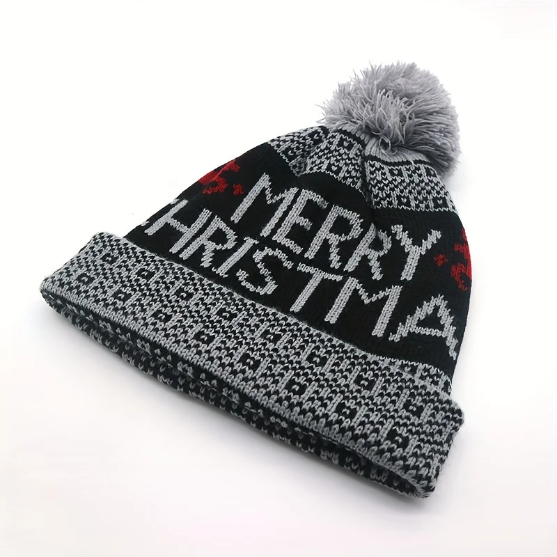 Experience the festive warmth and playful charm of this high-elastic fleece-lined knitted Christmas hat designed specifically for adults. Crafted from over 80% textile materials, with 100% acrylic outer fabric, lining, and filling, it offers exceptional insulation against winter chills. Its chunky knit construction features a ribbed brim for a snug fit and added comfort. The bold “MERRY CHRISTMAS” message is beautifully knitted into each design, complemented by cheerful color schemes like black, gray, and wine red. Topped with a fluffy pom-pom matching the overall color theme, this hat elevates your holiday look. Whether you're celebrating indoors or outdoors, this hat combines warmth, style, and holiday cheer perfectly suited to your festive spirit.