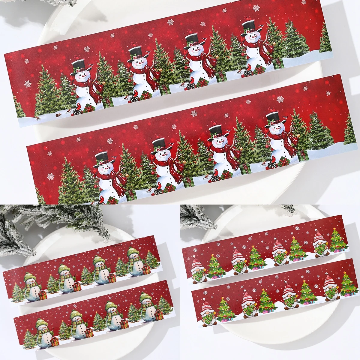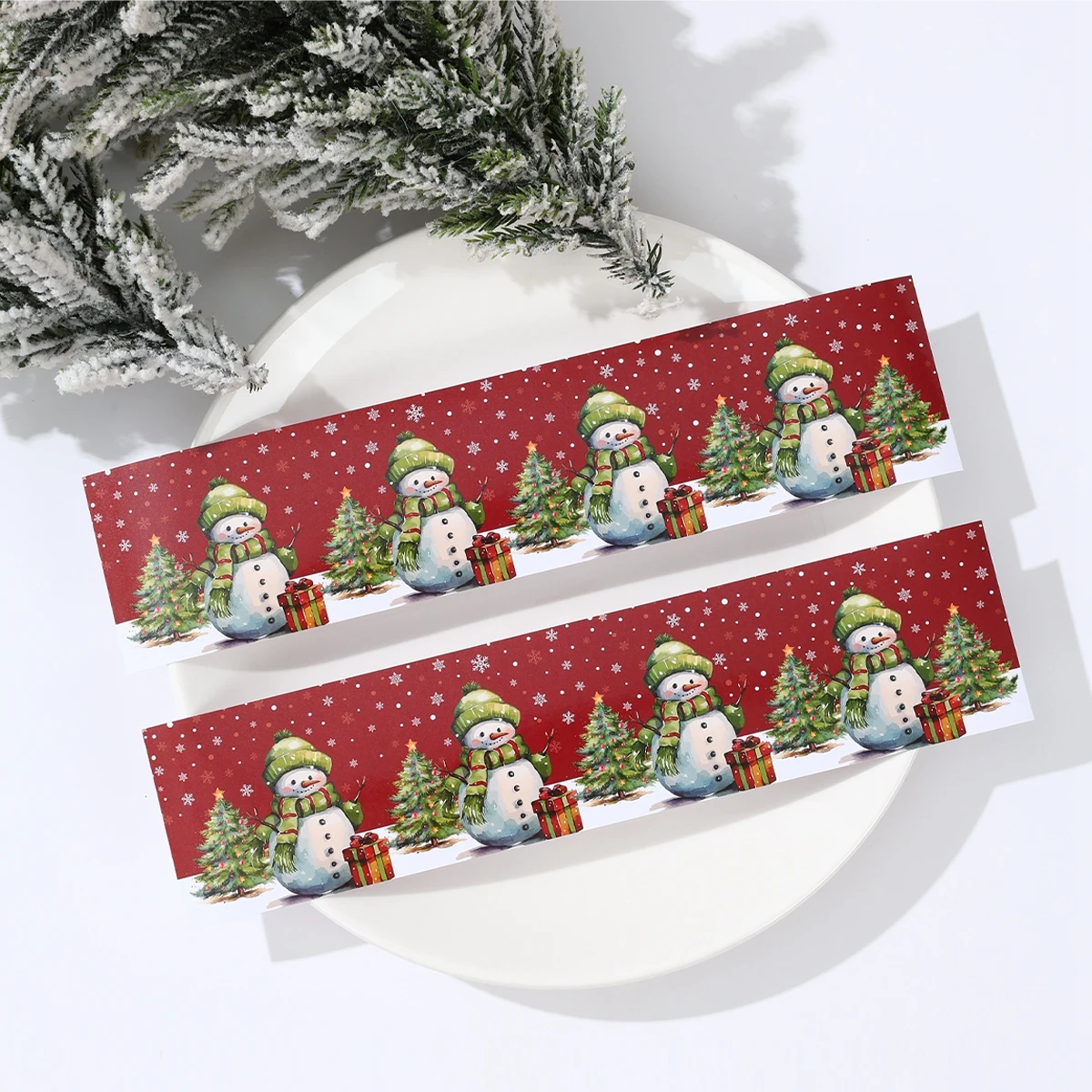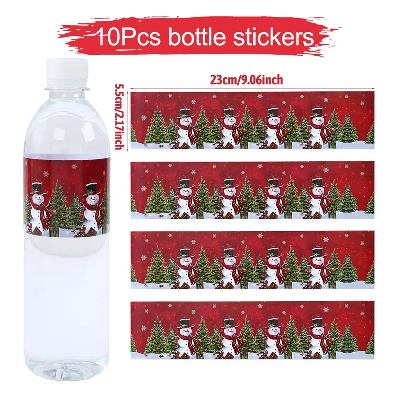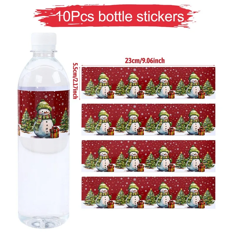 Transform your holiday bottles into charming festive decorations with this cheerful Christmas-themed sticker. Featuring a joyful Santa Claus scene, the vibrant design includes bright red backgrounds covered with delicate white snowflakes, creating a cozy winter atmosphere. The central illustration highlights a playful snowman dressed in a green knit hat with a fuzzy pom-pom and a matching scarf, surrounded by decorated pine trees with colorful ornaments and adorable presents underneath. All elements evoke the warmth and joy of Christmas, making your bottles perfect for holiday gatherings, gift exchanges, and home decorations. The stickers are easy to apply, durable, and designed to add a personal touch to your festive celebrations in 2024 and 2025.