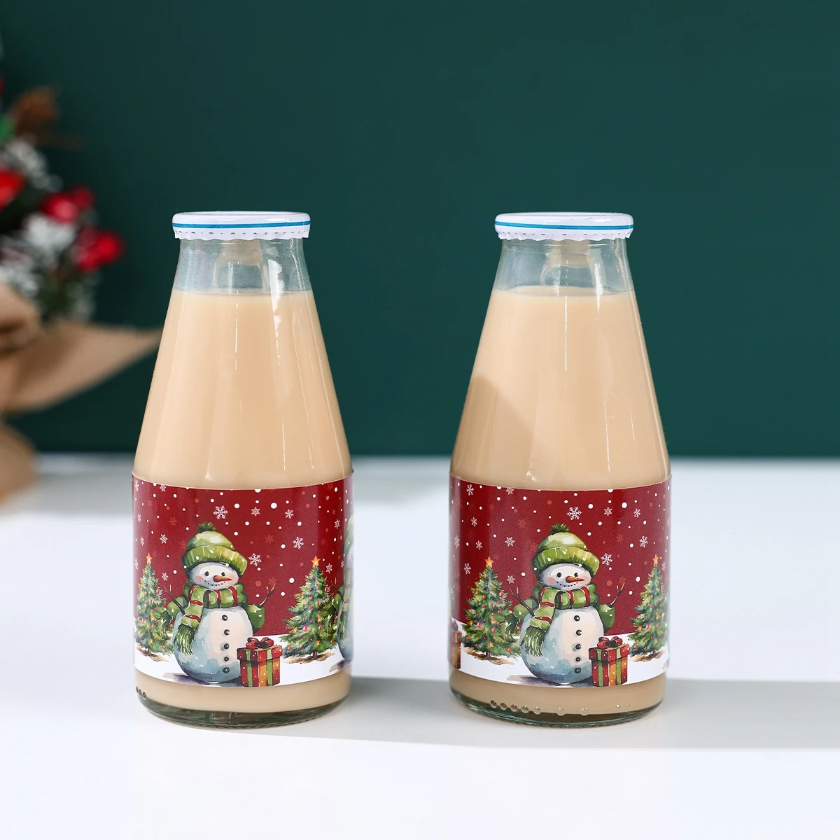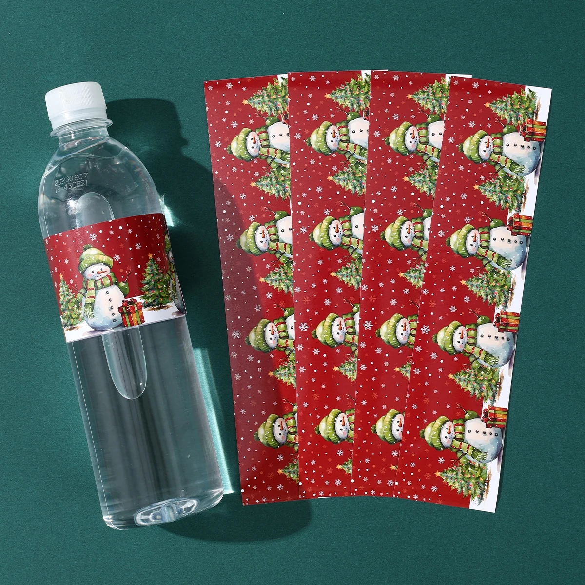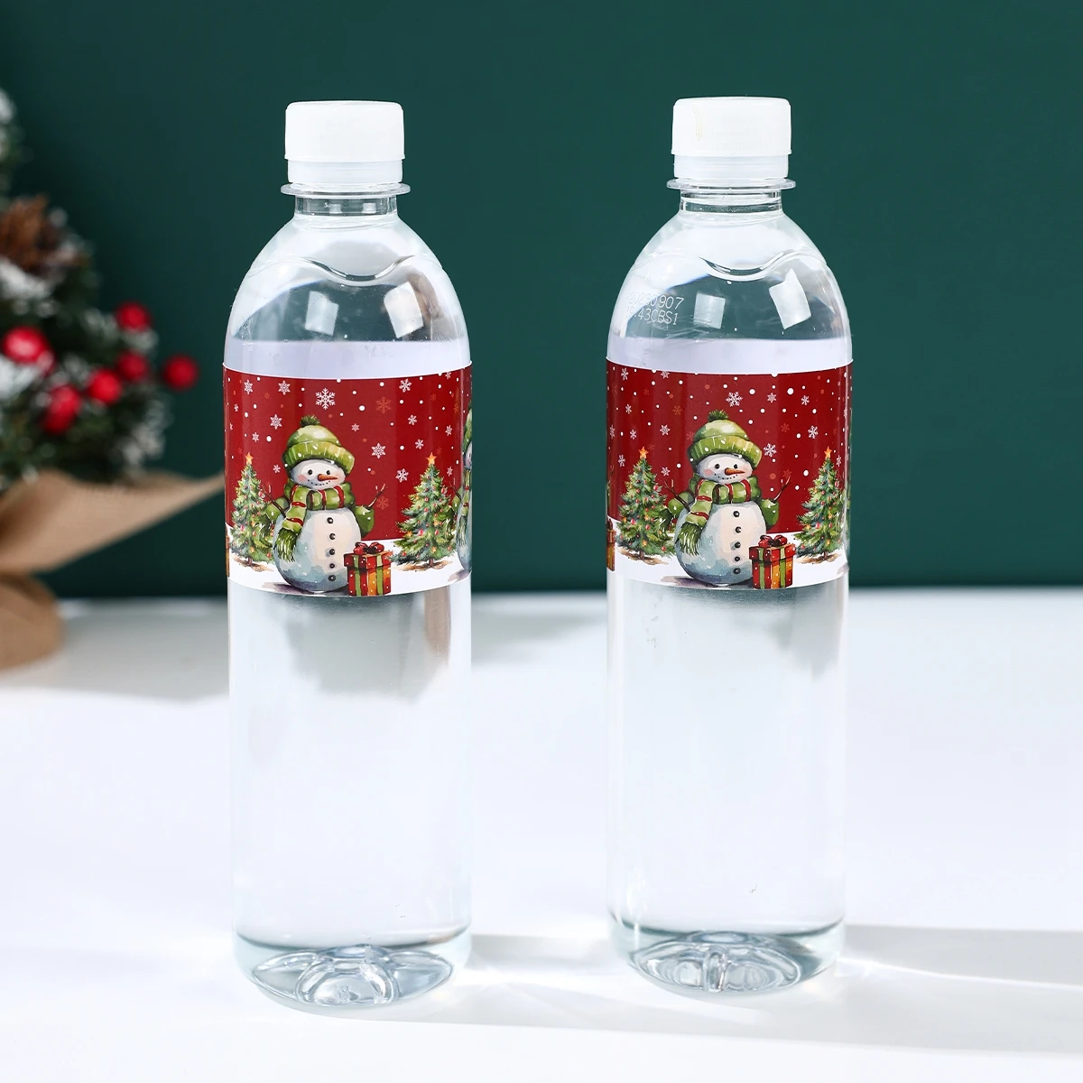 - Vivid, detailed holiday scene with a cheerful snowman, decorated pine trees, and presents creates a joyful Christmas vibe for your bottles.