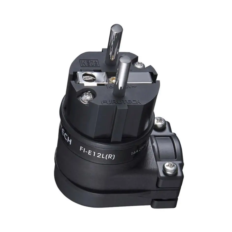 The FI-12 Power Cord Connector is expertly designed for high-performance audio applications, featuring rhodium-plated α (Alpha) pure-copper conductors that ensure superior conductivity. Its innovative adjustable L-shaped angled plug offers four settings for optimal configuration, while the floating field damper system effectively minimizes vibrations. Constructed from durable nylon and fiberglass with embedded carbon particles for resonance absorption, this connector is compatible with cable diameters ranging from 6.6mm to 18.0mm. With dimensions of 44.0mm x 42.2mm x 55.0mm and an overall length of 84.0mm, the connector is available in sophisticated Rhodium or stunning Gold EU plug options, making it a perfect match for high-end audio gear.