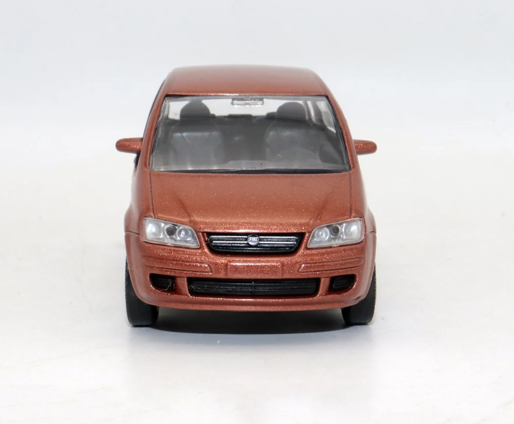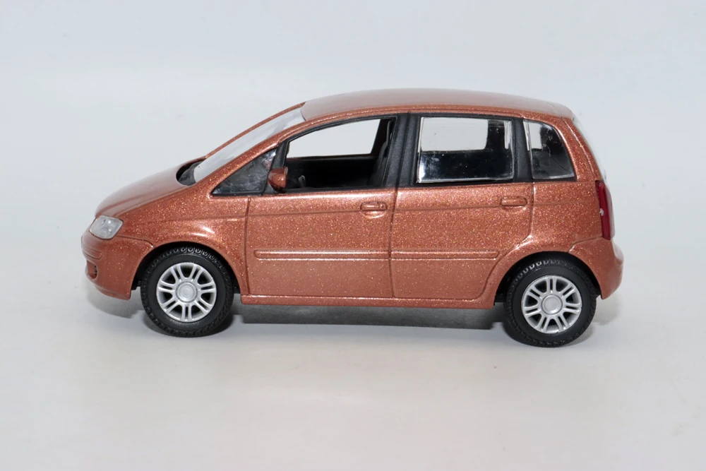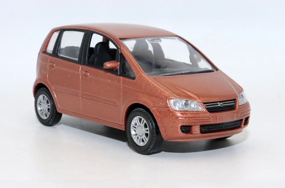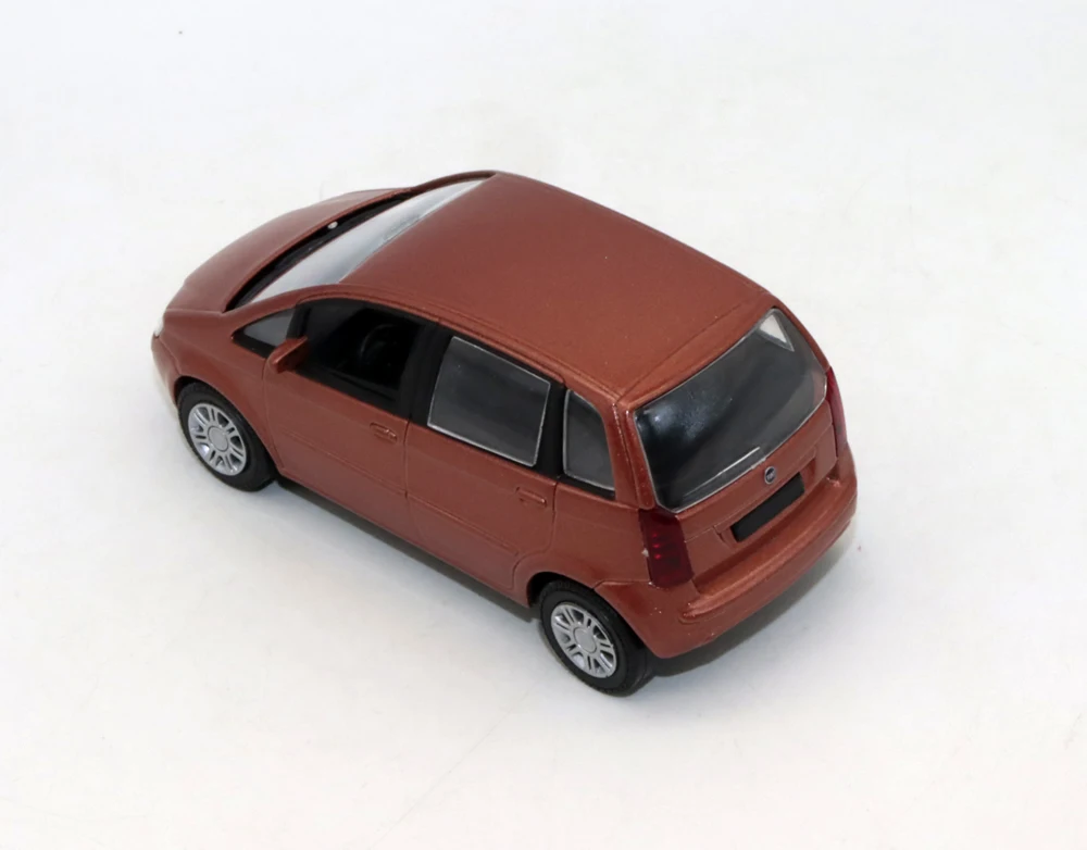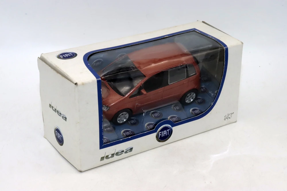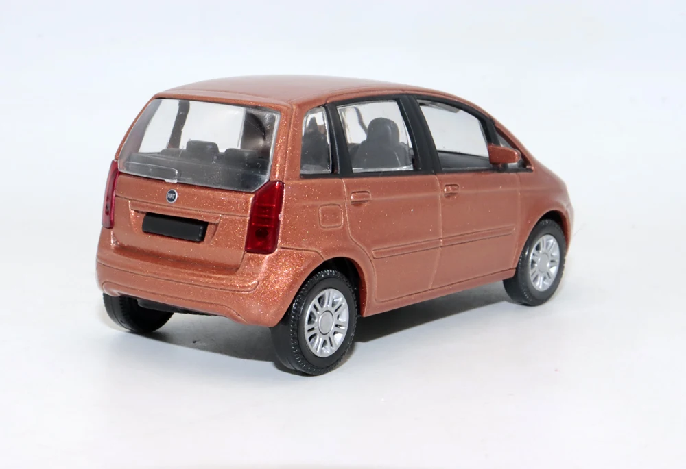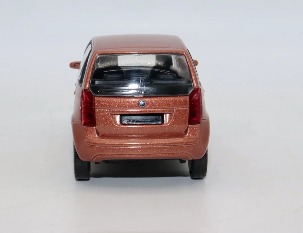 Experience the charm of the Fiat Idea SUV with this 1:43 scale model, crafted from high-quality diecast alloy and plastic, measuring approximately 8.5 cm. Its distinctive metallic brown color, paired with a glossy finish, captures attention. The model showcases rounded edges typical of SUVs, complemented by a stylish grille featuring the Fiat emblem and detailed headlights for realism. Clear plastic windows reveal a black interior with intricate seating and dashboard details. The wheels display a sleek five-spoke design with realistic black tires. This diecast model is perfect for collectors and enthusiasts who appreciate finely detailed automotive replicas.