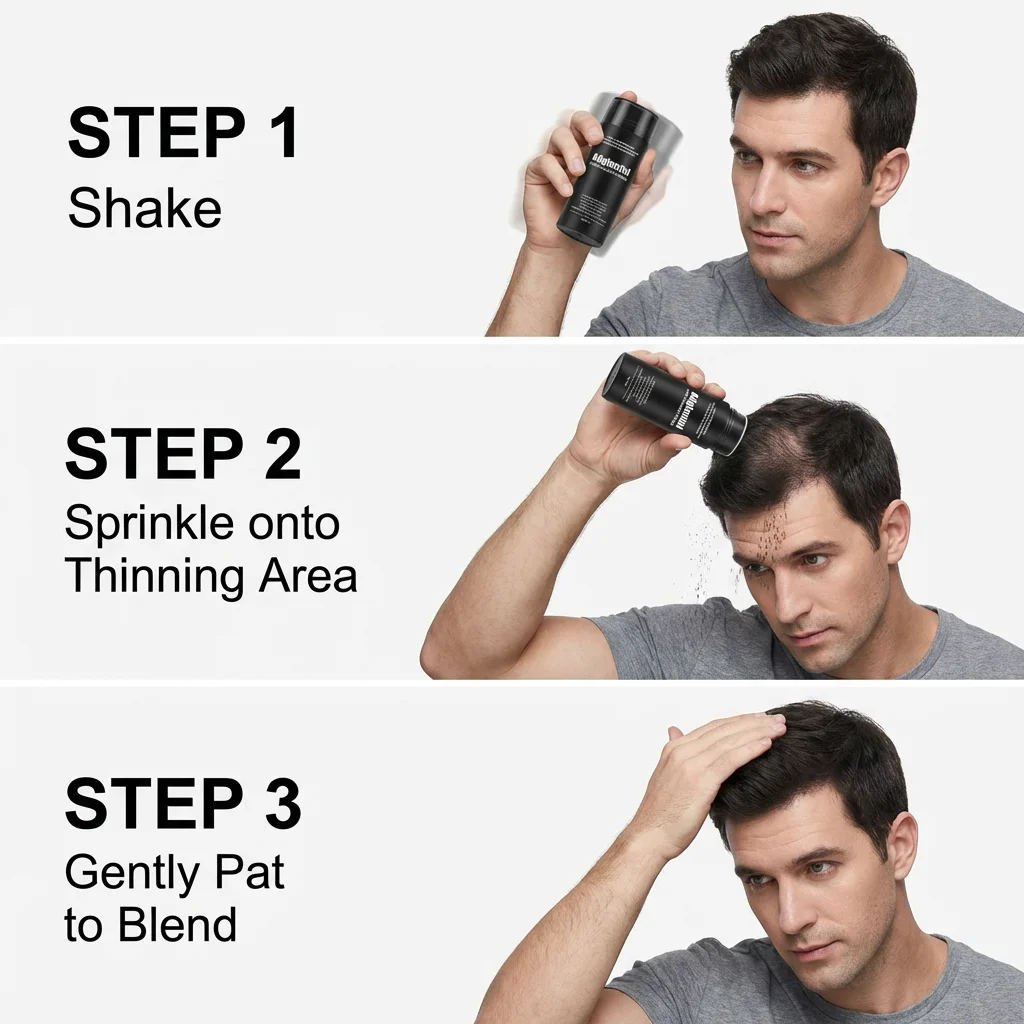 Achieve instant hair transformation with this 30g fiber powder, designed to add visible volume and fill in hairlines for a fuller, thicker look. Suitable for unisex use on normal hair types, it contains no high-concerned chemicals, ensuring a safe styling experience. Available in shades including Auburn, Black, Dark Brown, Grey, Light Brown, Medium Blonde, and Medium Brown, it seamlessly blends with various hair colors. Packaged in a sleek, black cylindrical bottle with a transparent cap, the formula provides a natural, undetectable finish. Perfect for parties, dates, or special occasions, this fiber powder enhances your confidence with quick, effective results.