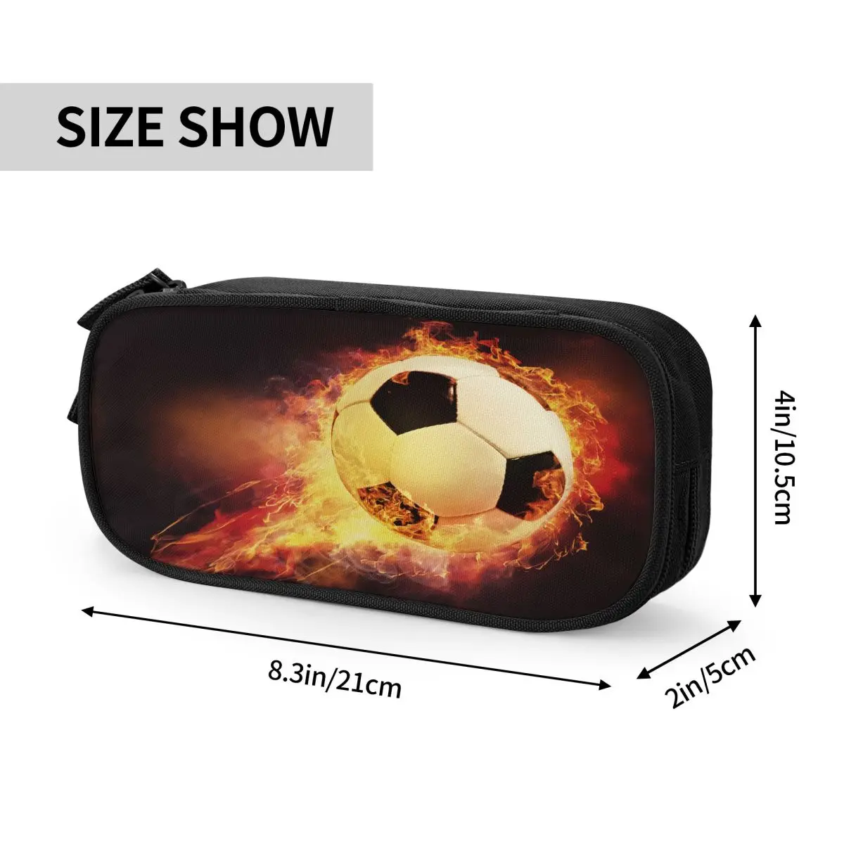 The Fire Balls Pencil Case is the perfect accessory for students and office-goers alike. Its elongated, rectangular shape ensures ample space for all your writing utensils, while the durable leather material with a smooth finish adds a touch of sophistication. The eye-catching graphic of a soccer ball amidst fiery colors like orange, red, and yellow creates an invigorating vibe, ideal for those who love sports. With a sturdy zipper closure and organized compartments, this pencil case ensures your stationery items are easily accessible and neatly arranged. Embrace a sporty style while staying organized with this trendy pencil case that truly stands out.