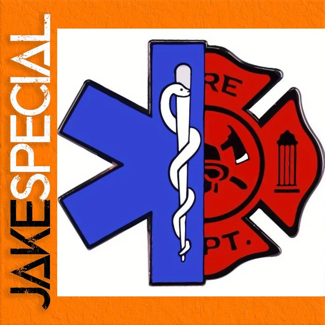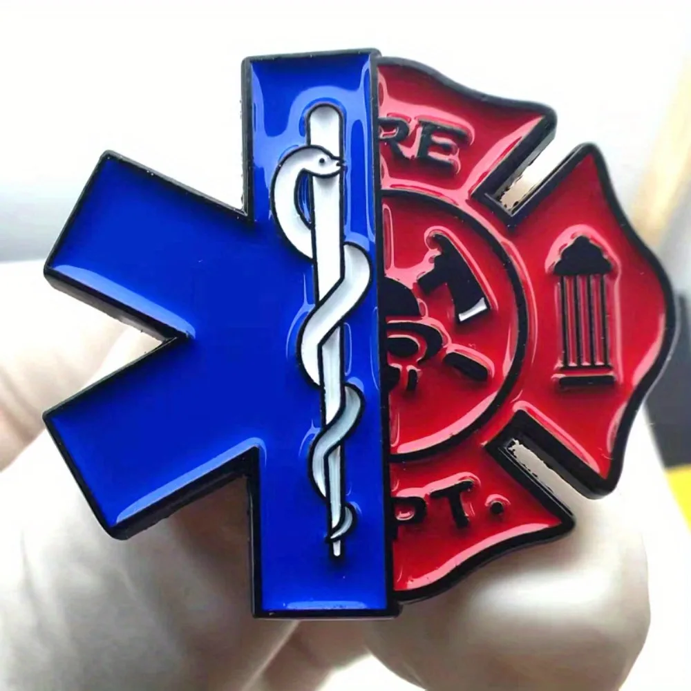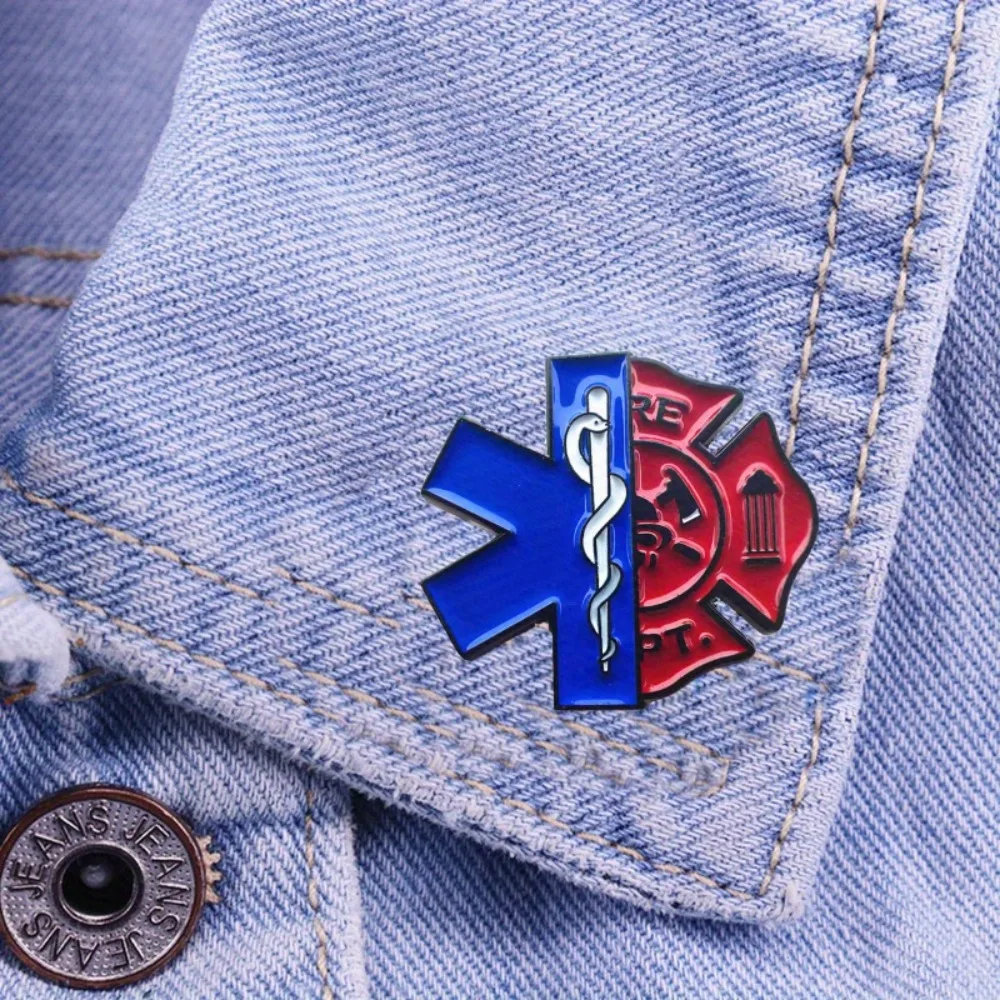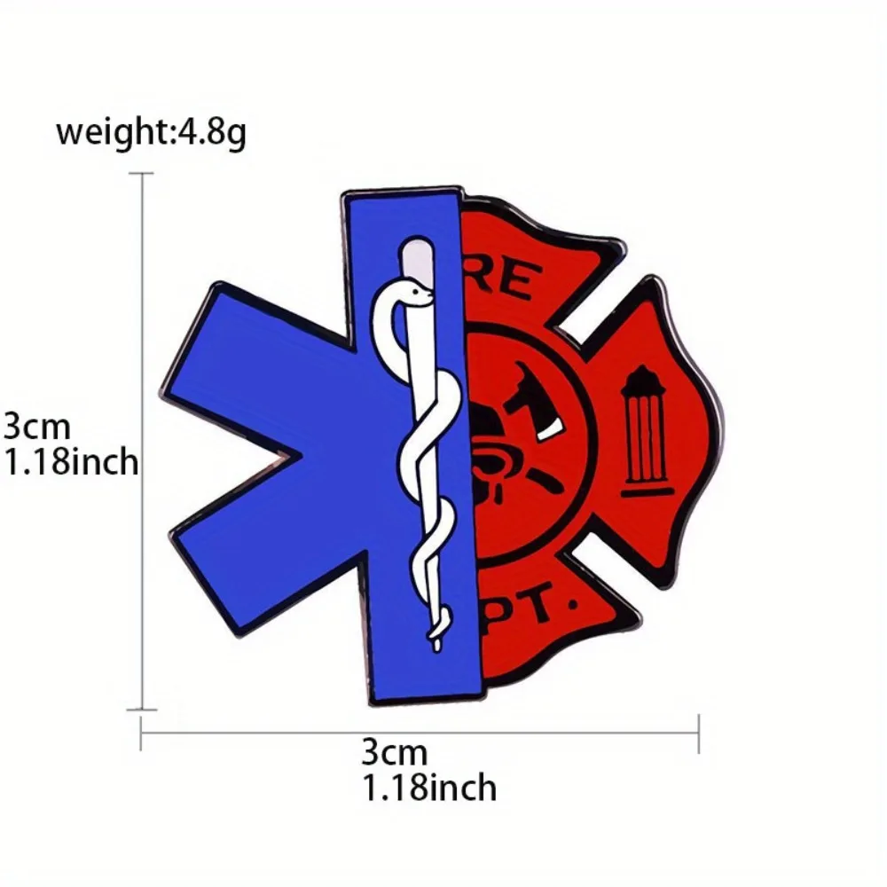This firefighter EMT pin combines elements of emergency medical services and fire safety into a striking design. The left side features a large blue Star of Life, prominently displaying a white caduceus within, symbolizing healthcare. On the right, a vibrant red fire department badge showcases iconic fire service symbols, such as an axe and a helmet, encapsulating bravery and community service. Crafted from a quality metal alloy, this pin boasts a shiny finish that complements both men's and women's fashion as it can adorn jackets, backpacks, or hats while reflecting a retro and patriotic style.