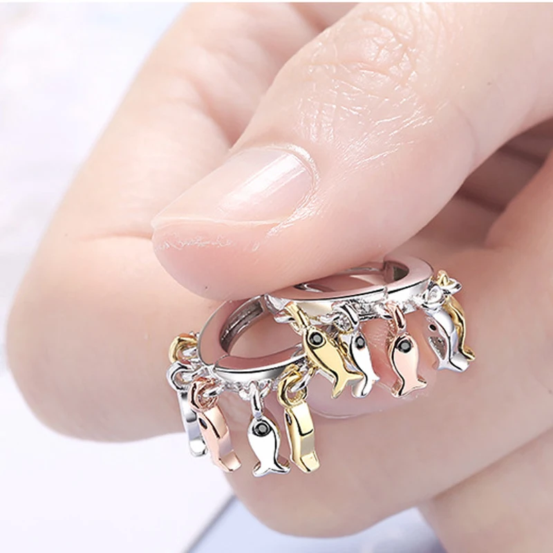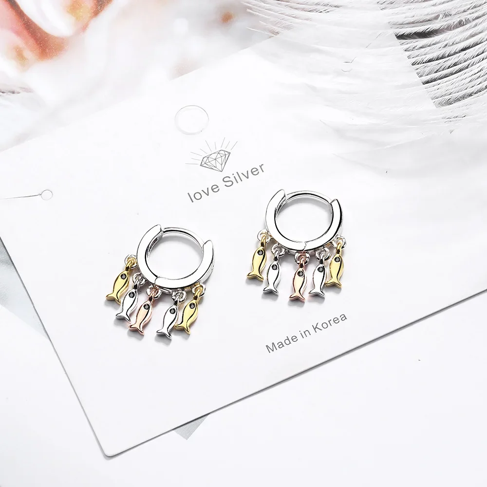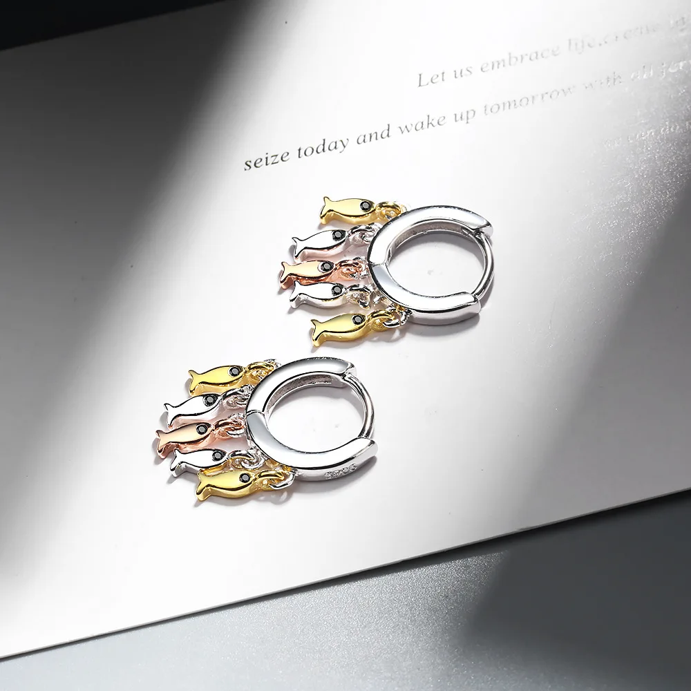 Enhance your style with these delicate 925 silver needle fish tassel earrings, weighing just 1.3 grams. Crafted from white gold-compatible metals, they feature a playful fish design adorned with round zircon stones in a sleek silver hue. The earrings dangle with charming fish-shaped charms in gold, silver, and rose gold tones, creating a vibrant contrast. Perfect for women and girls, their minimalist and modern aesthetic suits office or career settings, adding a touch of whimsy to your everyday look. Customize and pair them effortlessly for a refined yet fun accessory, ideal for expressing your individuality with elegance.