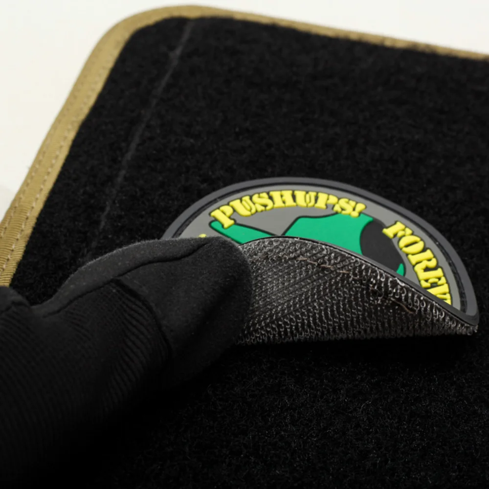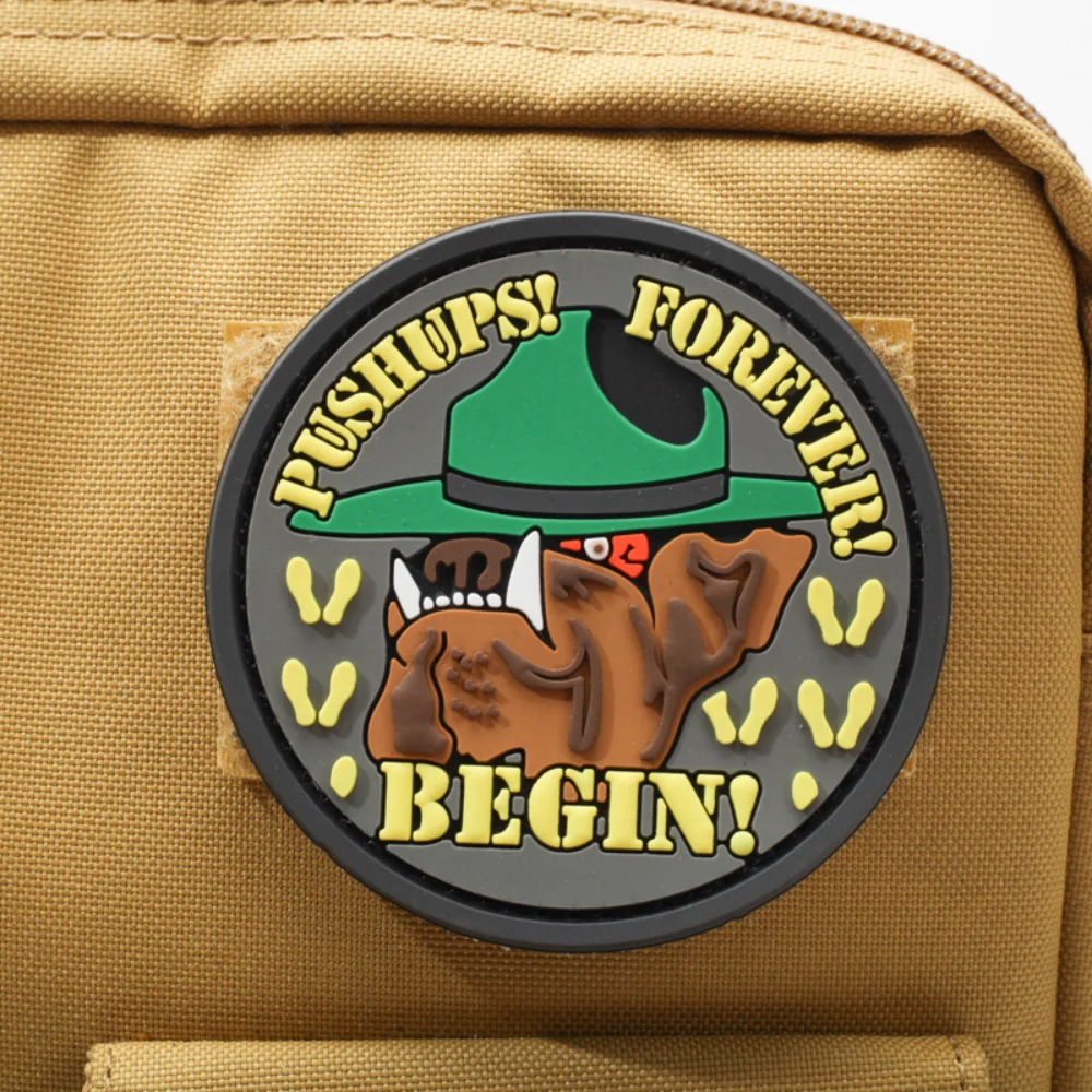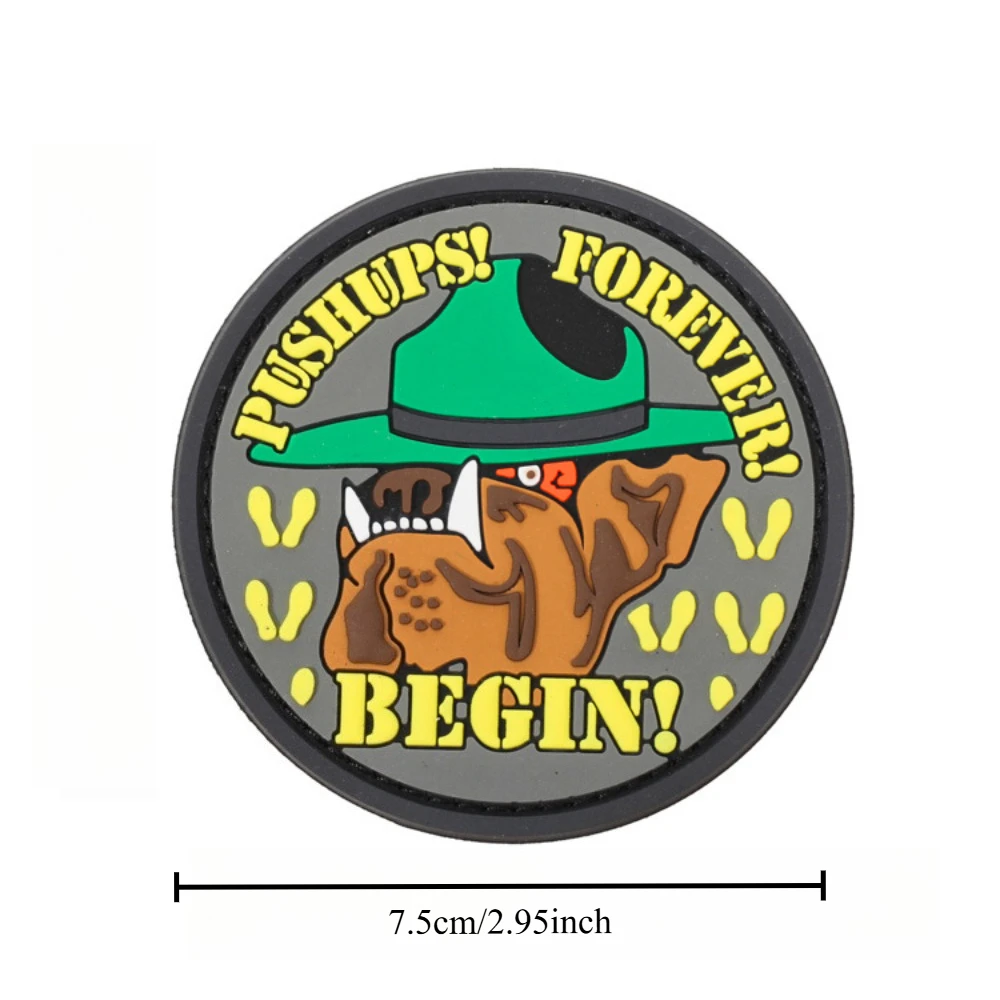 This vibrant PVC soft rubber patch measures 2.95″ in diameter and showcases a playful caricature of a muscular bulldog wearing a green wide-brimmed hat, adding a military flair. The background is a subtle grey that enhances the bold yellow phrases “PUSHUPS!” and “FOREVER!” with “BEGIN!” positioned at the bottom. Stylized paw prints in a lighter yellow encircle the design, reinforcing its fun theme. With a sturdy hook and loop backing for easy attachment, it’s perfect for jackets, backpacks, hats, DIY clothes, helmets, and military vests. Enjoy a durable, eco-friendly accessory that brings motivation and personality to your gear!