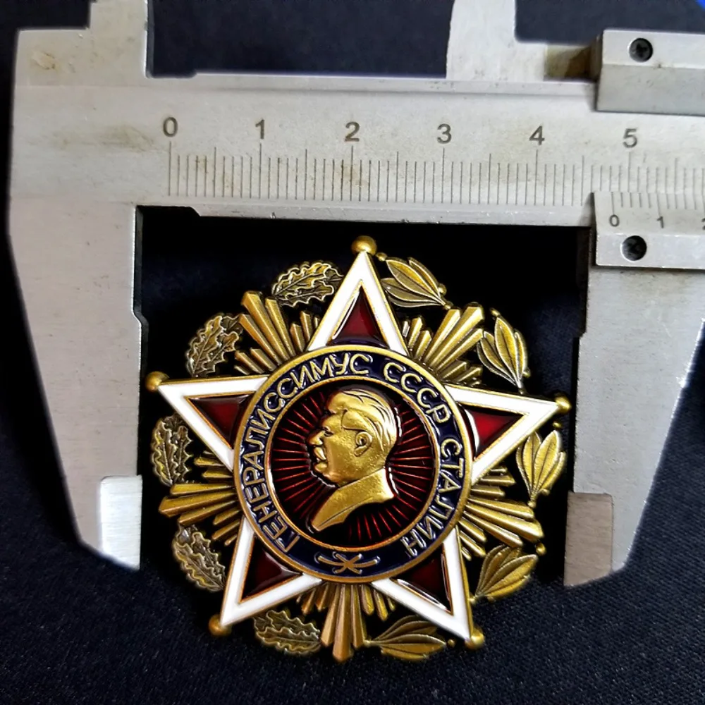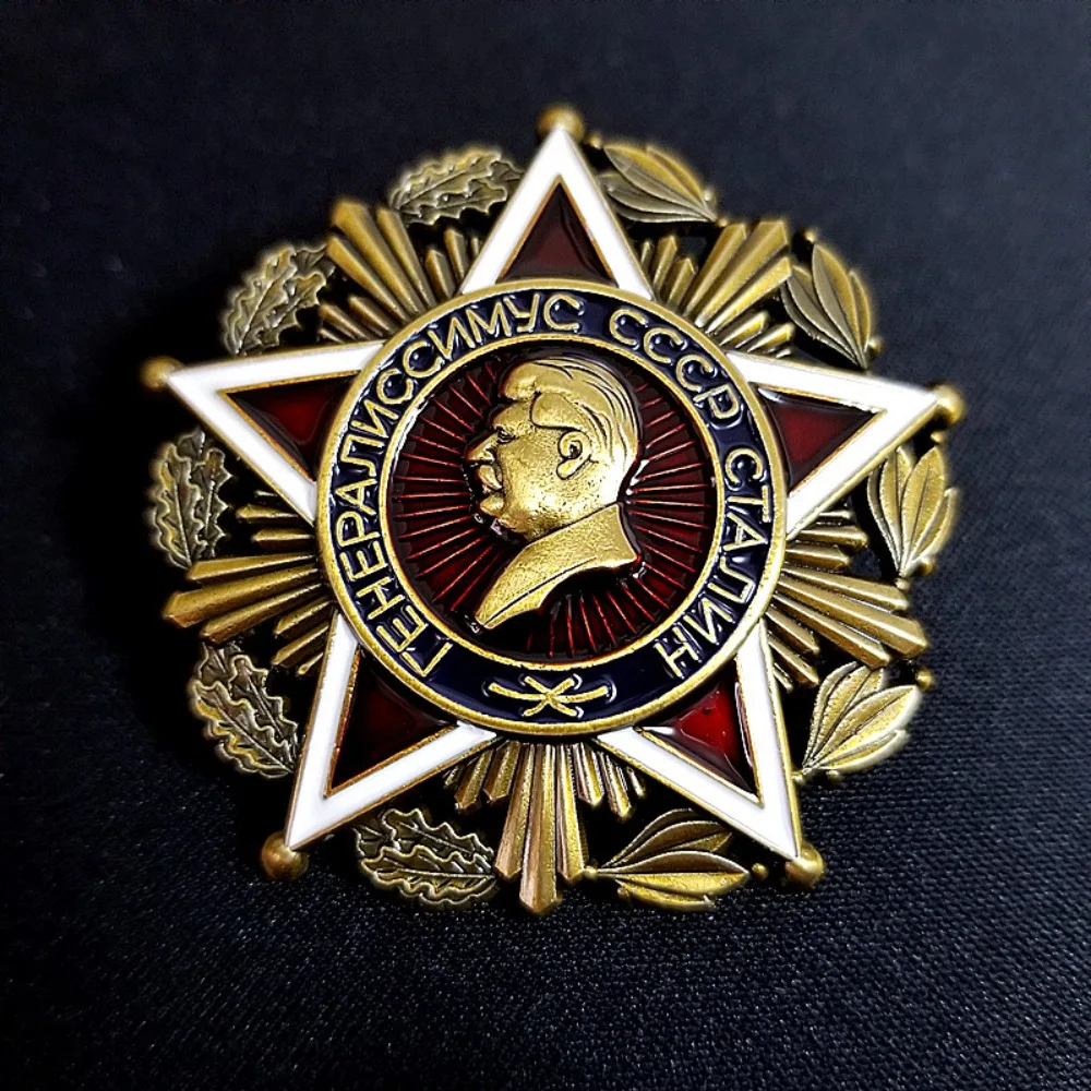 The five-pointed star metal pin badge is a striking commemorative piece, embodying a retro and patriotic style. Crafted from metal with a polished bronze finish, this badge captures attention with its intricate design. The central imagery features a detailed profile of a historical figure, surrounded by a richly colored ornate circular background in deep purples and golds. A ribbon with Russian text elegantly encircles the badge, enhancing its cultural significance. Perfect for jackets, backpacks, hats, or DIY projects, this versatile accessory showcases exceptional craftsmanship and distinctive aesthetic elements.