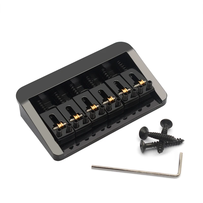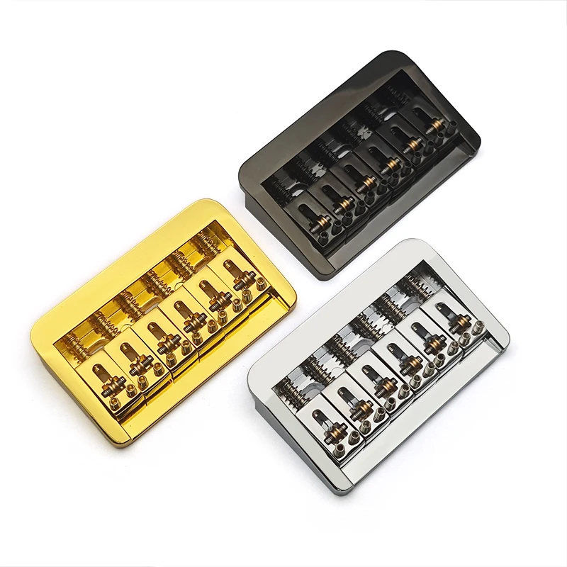 Experience the perfect balance of durability and elegance with this fixed guitar bridge, measuring 74x45mm. Its solid metal base plate provides a robust foundation, ensuring long-lasting performance. Brass roller saddles are included to maximize sustain and improve tonal clarity, making every note resonate beautifully. Designed for six strings with a precise 10.6mm spacing, it employs a string-through-body setup to deliver solid down pressure, enhancing sustain and resonance. The sleek finish options—black, gold, or chrome—add a sophisticated touch to any electric guitar. Easy to install, this hardware upgrade transforms your instrument with its reliable performance and classic style, allowing you to focus on your music without worry.