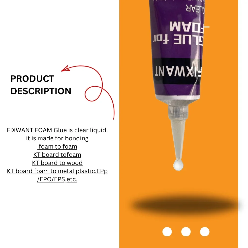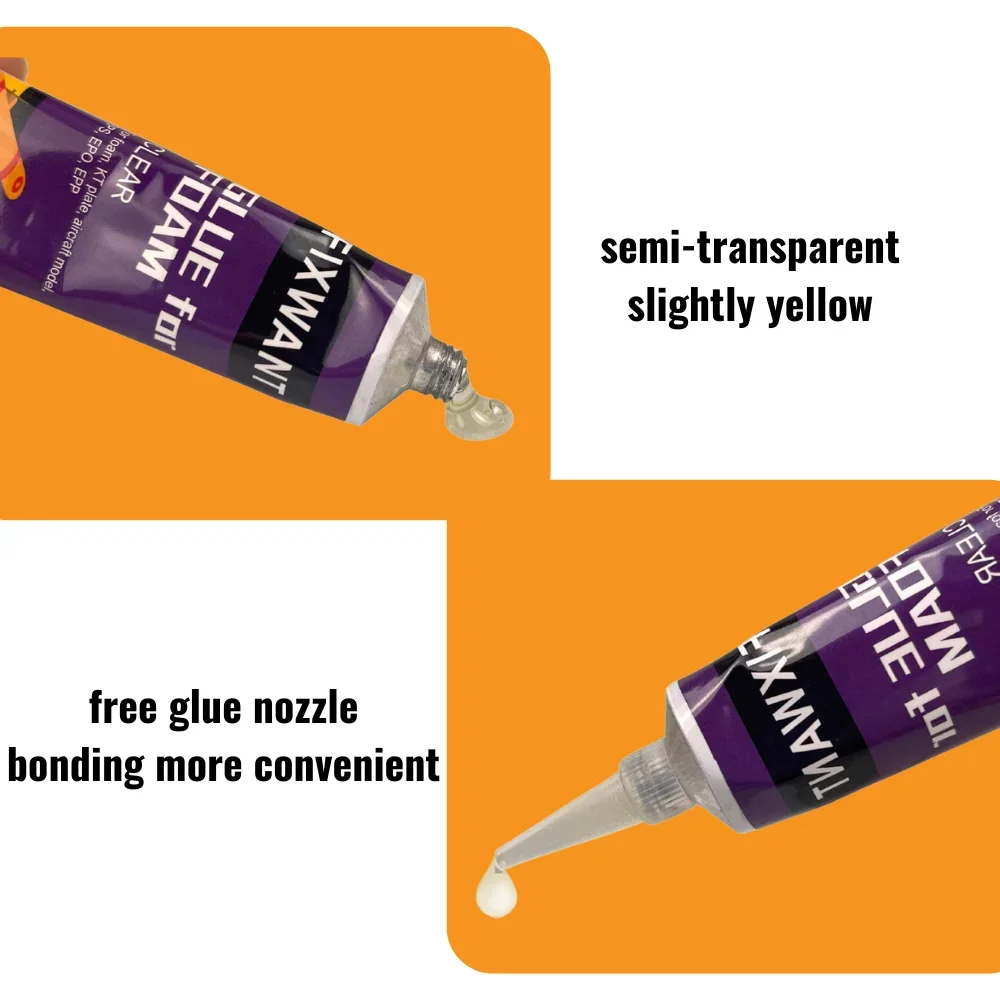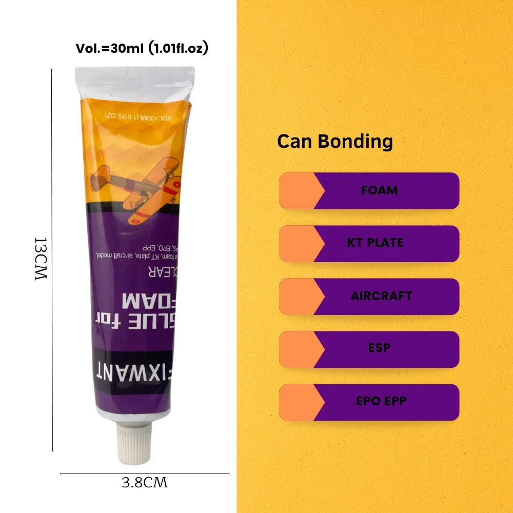 Imagine effortlessly bonding your foam projects with this high-quality FIXWANT Foam Glue. Designed for precision and strength, this 30ml clear liquid adhesive ensures your creations stay intact with waterproof, high-strength bonds. Whether you're working on models, crafts, or lightweight structures, this versatile glue adheres foam to foam, wood, metal, or plastic seamlessly. Its innovative formulation contains no high-concern chemicals, making it safe and effective for multiple materials. The sleek squeezable tube with a pointed applicator guarantees precise application, reducing waste and mess. The matching box displays a modern purple hue with bold white lettering, hinting at its professional-grade quality, while the small aircraft illustration symbolizes stability and precision in every bond. This glue is your go-to for durable, clean, and reliable results.