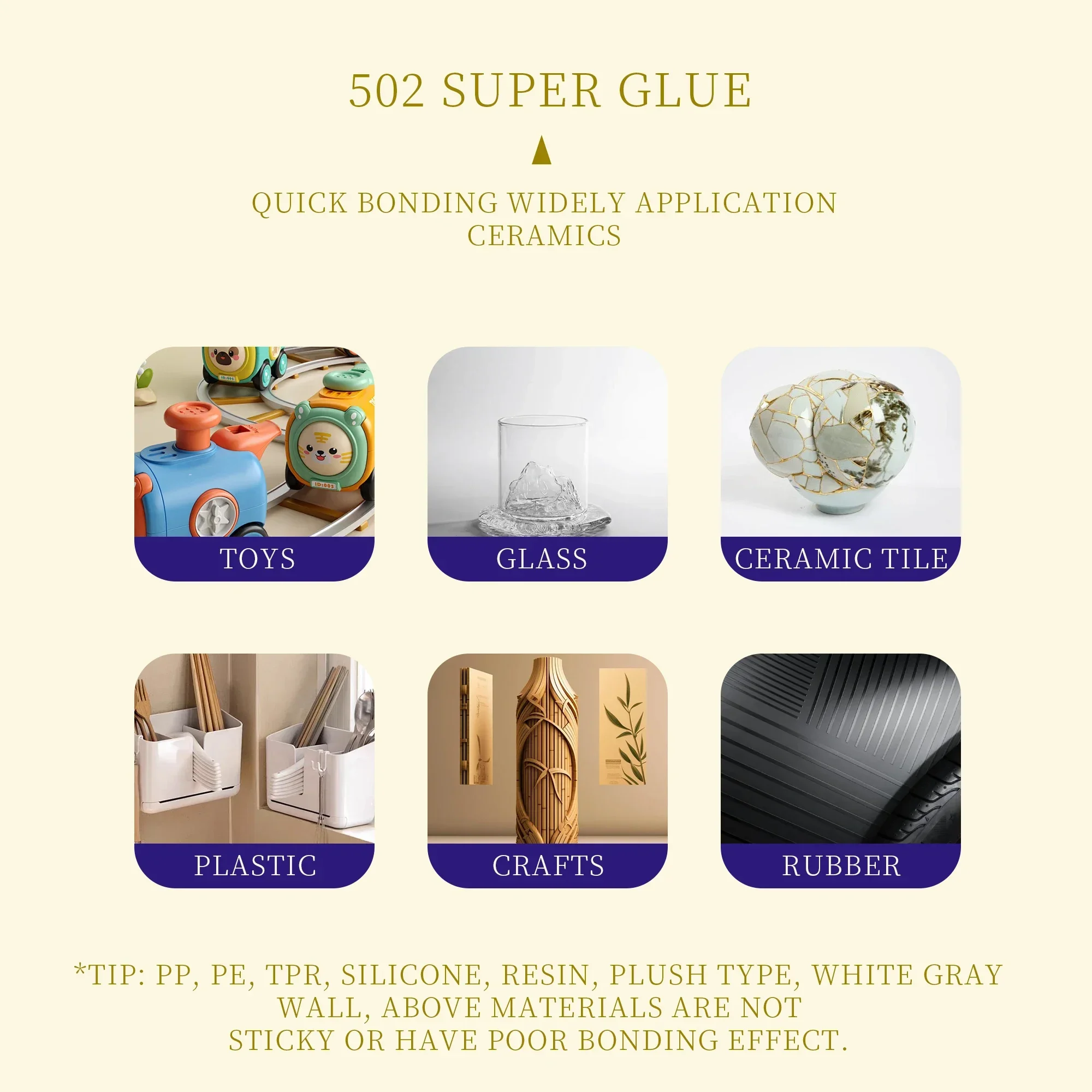 - The fast-acting adhesive bonds within 10 seconds on clean, dry surfaces, ideal for bonding metal, plastics (ABS, PS, PVC), ceramics, and wood with a strong, durable hold.